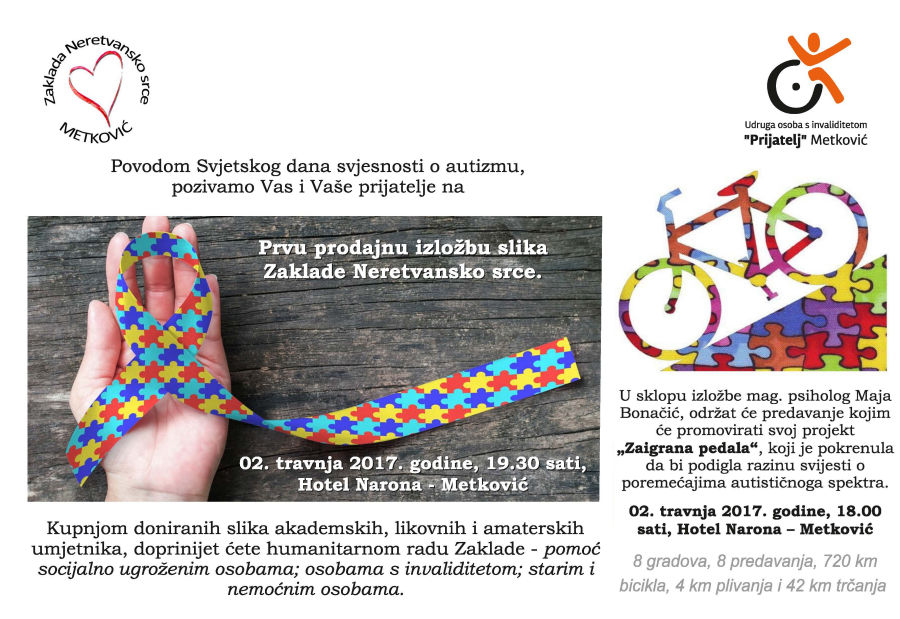 29.3.2017. - Povodom obilježavanja Svjetskog dana svjesnosti o autizmu Udruga osoba s invaliditetom „Prijatelj“ i Zaklada „Neretvansko srce“ želi ukazati na izazove u životu osoba s poremećajima iz spektra autizma.