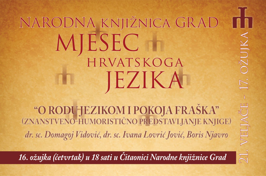 15.3.2017. - Od 21. veljače do 17. ožujka traje Mjesec hrvatskoga jezika, a u tijeku su i Dani hrvatskoga jezika. Sutra, 16. ožujka u Dubrovniku u Čitaonici Narodne knjižnice Grad počet će u 18 sati predstavljanje knjige O rodu jezikom i pokoja fraška, čiji je autor dr. sc. Domagoj Vidović.