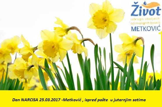 25.3.2017. - Metkovska Udruga oboljelih od malignih bolesti Život danas je Dan narcisa obilježila humanitarnom akcijom kojom su se skupljali prilozi za pomoć oboljelima od raka dojke, ali i ukazivalo na važnost redovitih mamografskih pregleda koji jamče rano otkrivanje bolesti i pravodobno liječenje. Svi koji su dali svoje priloge na dar su dobili vezicu narcica.