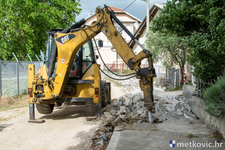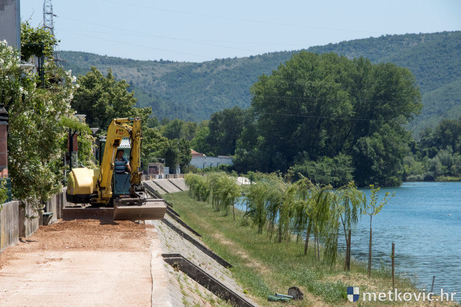 Metković, 31.5.2017. - Danas su započeli radovi na sanaciji šetnice uz Neretvu na Unki. Nakon uklanjanja staroga asfaltnog sloja položit će se novi, a postavit će se i nova komunalna oprema poput klupa i košara za otpatke.
