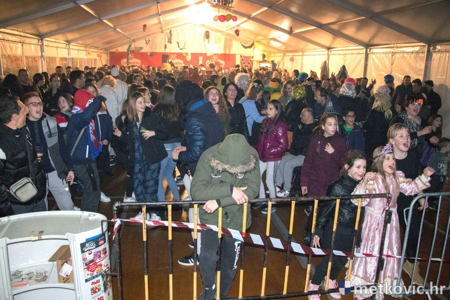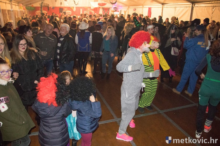 5.2.2018. - Pod pokladnim je šatorom sinoć održana prva u nizu zabava za maškarane i one koji još nisu odlučili u što će se maškarati. Atmosferu je grijala domaća Grupa Versi, a za nadoknadu u plesu potrošenih kalorija pobrinuo se Ivica Boras Kiko, koji je skuhao veliku teću junećega gulaša s njokama.