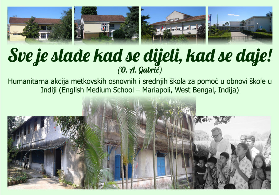 22.2.2018. - Pod pokroviteljstvom Grada Metkovića od 21. do 28. veljače u Metkoviću održavat će se Dani oca Ante Gabrića, u sklopu čega će se i ove godine provesti humanitarna akcija pomoći misijskim postajama našega velikog misionara. Ove godine bila bi to obnova stare škole u English Medium School u Mariapoliju u indijskome Zapadnom Bengalu.