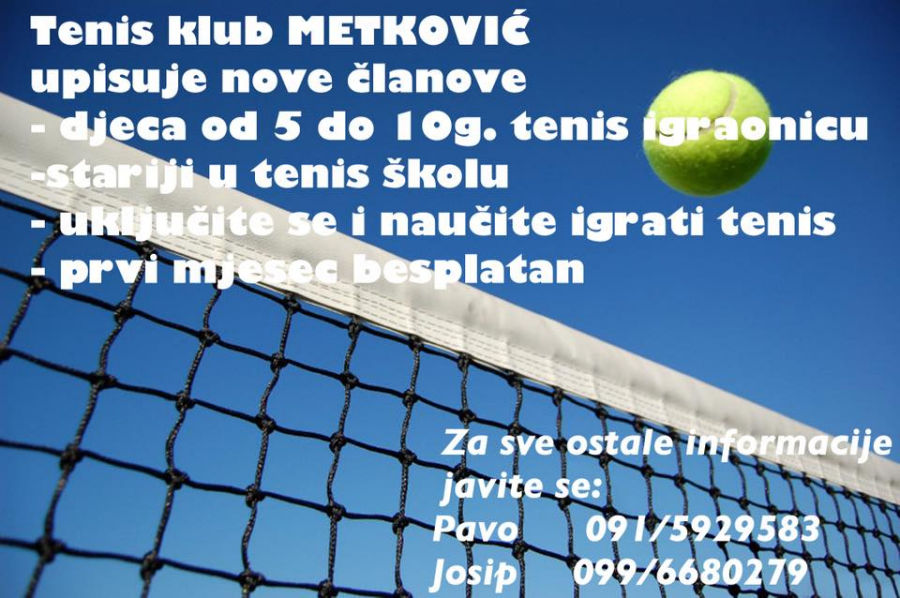 19.2.2018. - Teniski klub Metković objavio je upis novih članova. Za djecu od 5 do 10 godina organiziraju tenisku igraonicu, a za starije tenisku školu. Za oboje prvi mjesec besplatno.