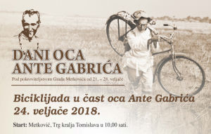 22.2.2018. - U sklopu manifestacije Dani oca Ante Gabrića, što se od 21. do 28. veljače održava pod pokroviteljstvom Grada Metkovića, u subotu, 24. veljače u organizaciji BK Relax, BK Metković i TZG-a Metković održat će se biciklijada u čast ocu Antu Gabriću.