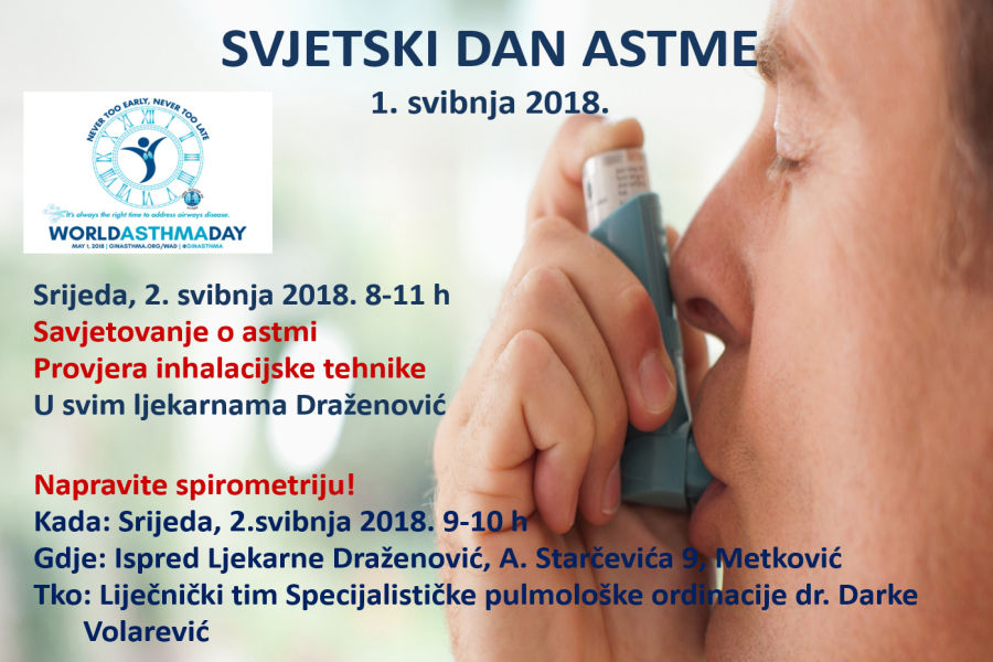 30.4.2018. - Ljekarnički tim Ljekarne Draženović već treću godinu obilježava Svjetski dan Astme. Astma pripada među četiri najčešće kronične bolesti, srčano-žilne, moždano-žilne i šećernu bolest.
