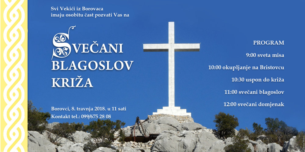 3.4.2018. - Svi Vekići iz Borovaca pozivaju u nedjelju, 8. travnja na svečani blagoslov križa na brdu iznad Borovaca. Nakon mise, koja počine u 9 sati, okupljanje je u 10 sati na Bristovcu, otkuda u 10:30 počinje uspon do križa. U 11 sati je blagoslov, a u 12 sati domjenak.