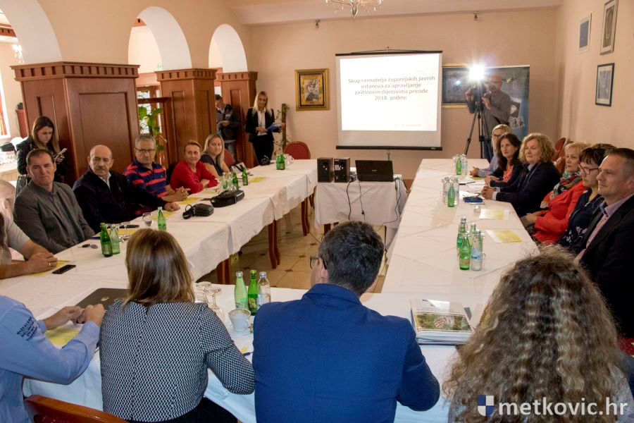 4.10.2018. - U Metkoviću je jučer započeo trodnevni Skup ravnatelja županijskih javnih ustanova za upravljanje zaštićenim dijelovima prirode, na kojemu je uz ravnatelje sudjelovao pomoćnik ministra za zaštitu okoliša i energetiku Igor Kreitmeyer iz Uprave za zaštitu prirode te Aljoša Duplić, stručni voditelj Hrvatske agencije za okoliš i prirodu.