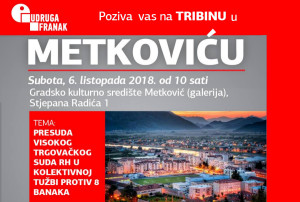 5.10.2018. - Udruga 'Franak' poziva vas u subotu, 6. listopada na tribinu čija je tema presuda Visokoga trgovačkog suda RH u kolektivnoj tužbi protiv osam banaka. Tribina počinje u 10 sati u Galeriji GKS-a Metković.