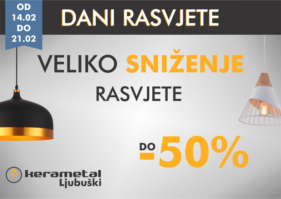 13.2.2019. - Ne propustite veliko sniženje rasvjete u prodajnom centru AT Kerametal. Posjetite naš odjel rasvjete od 14. do 21. veljače, u kojemu Vas očekuju popusti i do 50 %. Unesite svjetlo u svoj dom!