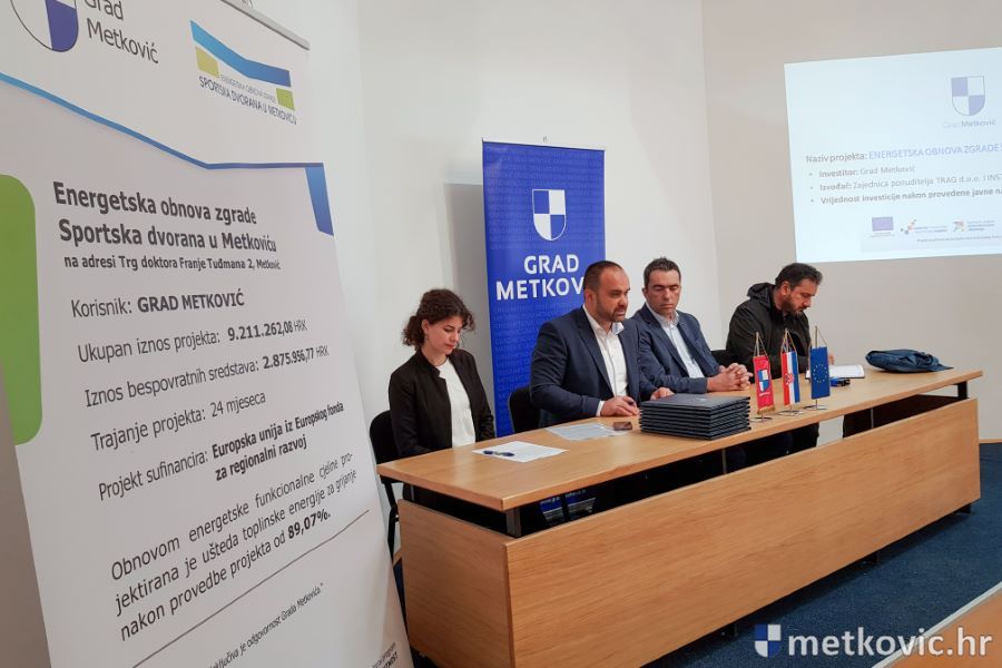 12.4.2019. - Metkovski gradonačelnik Dalibor Milan danas je u Zgradi političkih stranaka s Valentom Šutalom, predstavnikom zajednice izvođača Trag d.o.o. i Instaling d.o.o. potpisao Ugovor o izvođenju radova na energetskoj obnovi Gradske sportske dvorane. Potpisivanju Ugovora nazočio je Ivan Goluža iz Projektantskog ureda Arhitektura i graditeljstvo Goluža d.o.o., koja je izradila Projekt obnove.