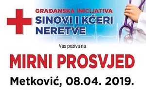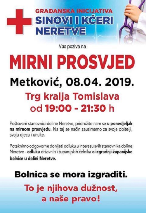 8.4.2019. - Građanska inicijativa Sinovi i kćeri Neretve poziva vas večeras na Trg kralja Tomislava na kojemu se od 19 do 21:30 održava mirni prosvjed s jednom porukom – Županijska bolnica regionalnoga značaja u dolini Neretve.