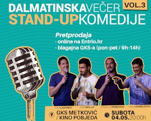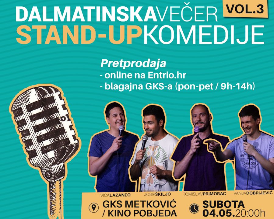 26.4.2019. - SplickaScena treći put ove godine dolazi u Metković, a kao što su i obećali, splitski komičari i ovom prilikom izvode potpuno novi šou i potpuno nove baze. Nasmijavat će vas trojac kojeg ste već upoznali: Tomislav Primorac, Josip Škiljo i Ivica Lazaneo, a u svom premijernom nastupu u Metkoviću predstavit će vam se i Vanja Dobrijević. Vidimo se u GKS-u 4. svibnja na još jednoj večeri ispunjenom smijehom! Ne propustite “Dalmatinsku stand-up comedy večer Vol. 3”.