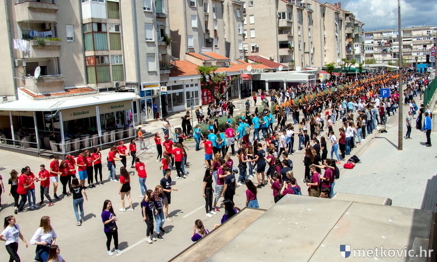 Metković, 22.5.2019. - Bučno i veselo metkovski maturanti danas slave posljednji dan nastave. Mi smo ih zatekli kako od škole kreću ka Trgu kralja Tomislava. Danas pred podne u Sportskoj ulici plesat će četvorku u sklopu plesnog projekta Maturantska parada 2019. – Quardilla dance parade 2019.