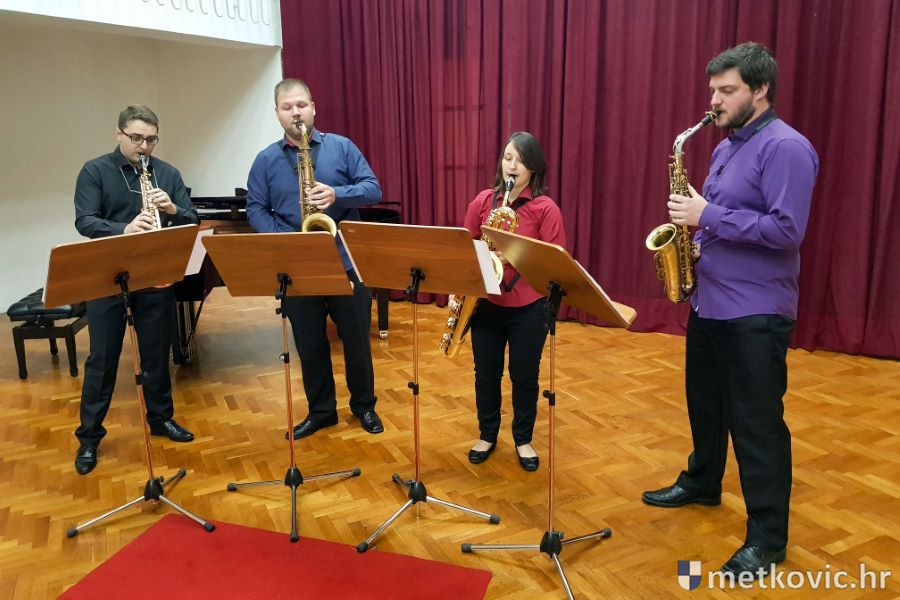 Metković, 31.5.2019. - U sastavu Marko Gerbus (sopran saksofon), Deni Pjanić (alt saksofon), Nereo Arbula (tenor saksofon) i Metkovka Erna Čizmić Rebić (bariton saksofon) sinoć se domaćoj publici predstavio kvartet mladih saksofonista, diplomanada i studenata Umjetničke akademije u Splitu u klasi prof. Gordana Tudora.