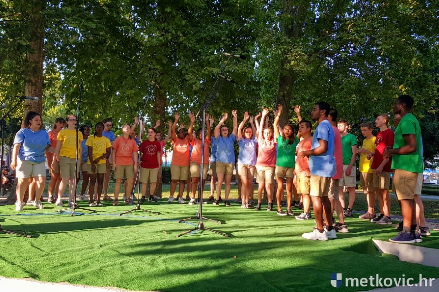 Metković, 15.7.2019. - Svoj boravak u Metkoviću u organizaciji OŠ Stjepana Radića Zbor Boston City Singers završio je koncertom u Gradskom parku, na kojemu su, između ostaloga, pjevali Tango s Neretve , koji su naučili na radionici tijekom druženja s našim učenicima.