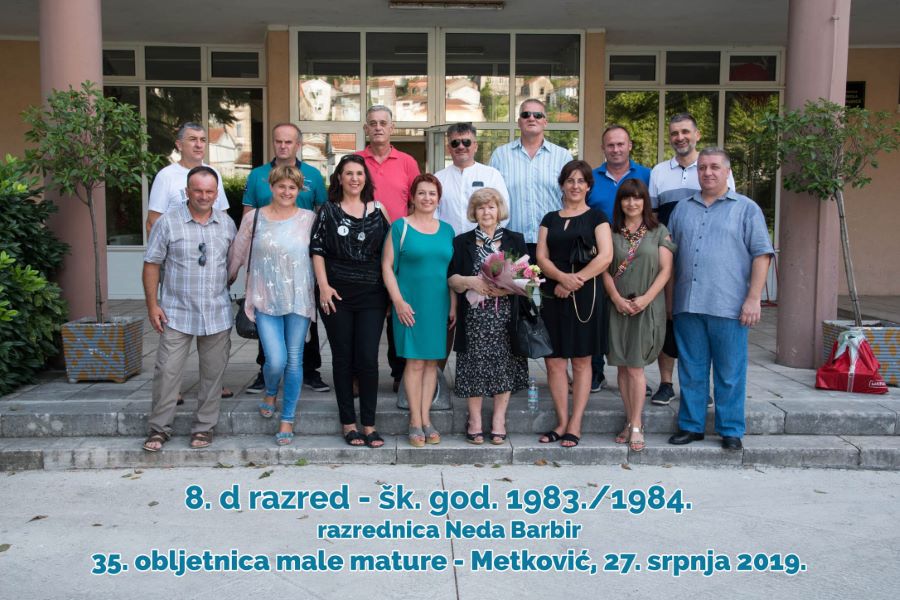 Metković, 30.7.2019. - Naraštaj rođen 1969./70. sastao nakon 35 godina kako bi proslavio malu maturu 8. D razreda iz školske godine 1983./84., koji je vodila razrednica Neda Barbir r. Šalinović. Od njih 27 proslavi se odazvalo 14 bivših kolega.