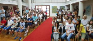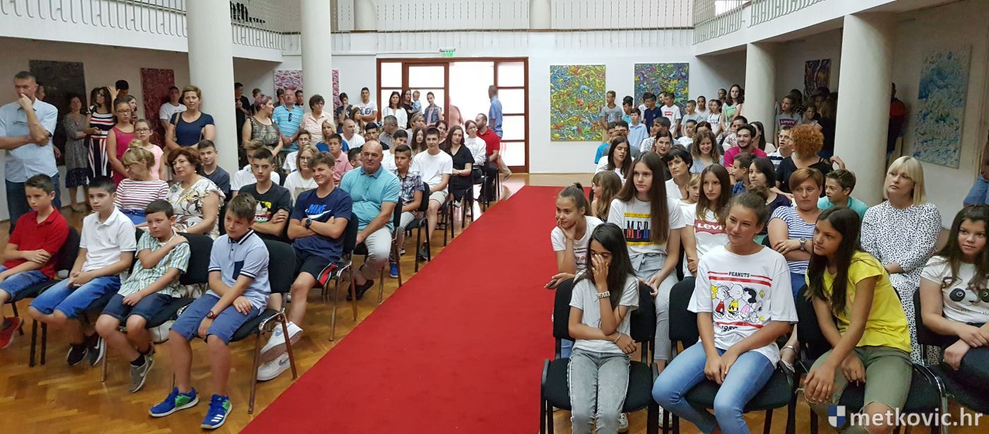 Metković, 11.7.2019. - Metkovski gradonačelnik Dalibor Milan jučer je u Galeriji GKS-a primio više od 170 učenika i mentora četiriju metkovskih škola te im uručio priznanja za promicanje ugleda Metkovića sudjelovanjem na državnim natjecanjima i smotrama. Osvajačima prvih triju mjesta uručio je i novčane nagrade.