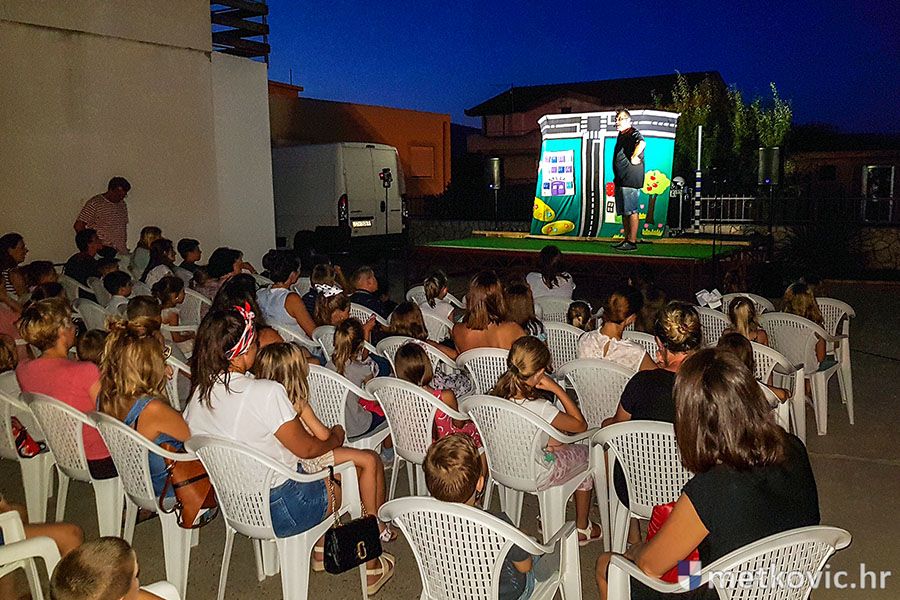 Metković, 25.7.2019. - Splitska Produkcija Z sinoć je na platou pred crkvom sv. Nikole odigrala edukativnu interaktivnu predstavu ‘Prometna priča’, koja govori o ponašanju u prometu.