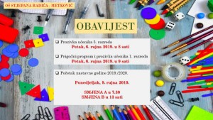 3.9.2019. - OŠ Stjepana Radića obavještava o prozivkama 6. rujna i početku nastavne godine 9. rujna.