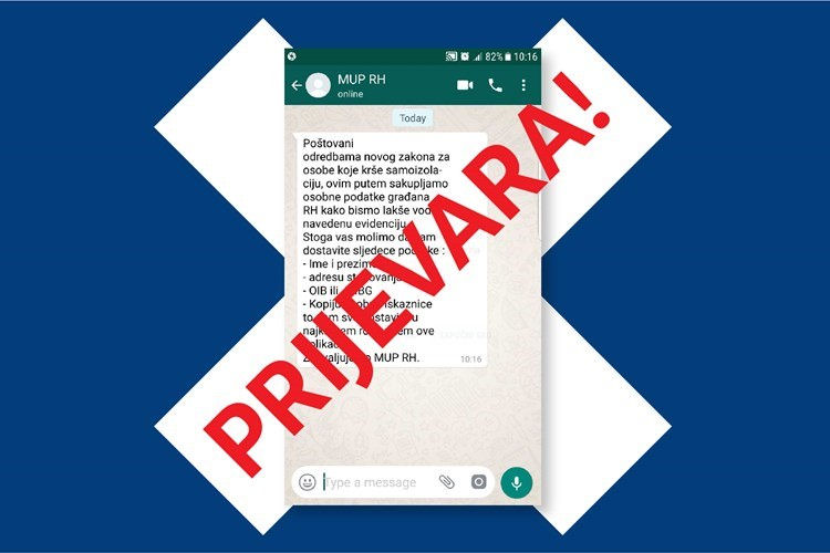 20.3.2020. - Zaprimili smo informacije da naši građani putem mobilnih aplikacija za razmjenu poruka, fotografija i videozapisa na pametnim telefonima zaprimaju obavijesti putem kojih se traži da, zbog izrade evidencije o prekršiteljima mjera samoizolacije, povratno dostave osobne podatke – upozoravaju iz MUP-a .