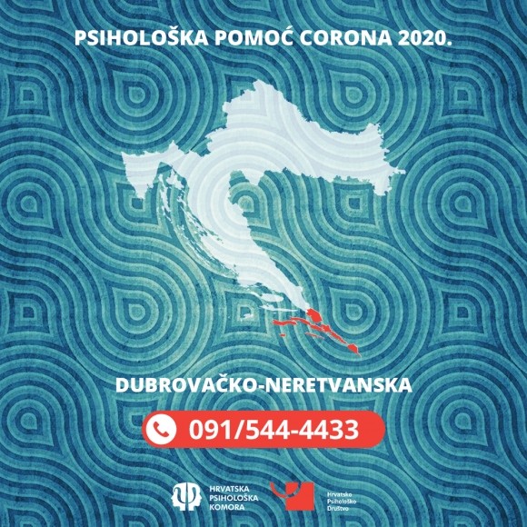 25.3.2020. - Hrvatska psihološka komora u suradnji s Hrvatskim psihološkim društvom i psihološkim društvima pojedinih županija otvorilo je telefonske linije za pružanje psihološkog savjetovanja uslijed epidemije koronavirusa (COVID-19). Psihološku pomoć građani Dubrovačko-neretvanske županije mogu zatražiti na broj 091/544 4433 od 00 do 24 sata, svakog dana u tjednu. Na telefonu će biti dostupni psiholozi volonteri, kojih je za sada četiri.