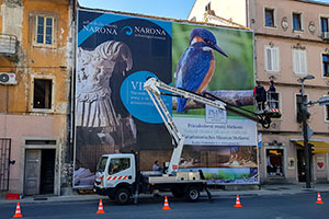18.3.2020. - Fasada ruševne zgrade u Ulici Stjepana Radića, koja već godinama nagrđuje izgled grada pri silasku s Lučkoga mosta na lijevu stranu, dobila je „presvlaku“ u vidu velikoga panoa na kojemu su reklame za Arheološki muzeja Narona u Vidu te Prirodoslovni muzej Metković. Svakako dobro privremeno rješenje, a zanimljivo je i to da će pano biti pod videonadzorom. Pano je izradila metkovska tvrtka T-reklam, a izradu je financirao Grad Metković.