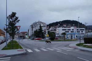 Metković, 1.4.2020. - Gledamo ovih dana kako životinje ulaze u opustjele gradove. Jutros oko 6:30 snimili smo u Metkoviću neobičan prizor – divlju svinju kako istrčava iz Sportske ulice i pretrčava Ulicu Ante Stračevića. Vjerojatno se uputila prema Neretvi na vodu.