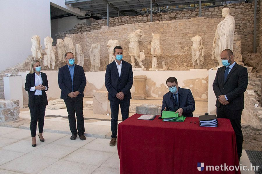 Metković, 9.11.2020. - U Vidu je danas potpisan okvirni sporazum za izgradnju nove zgrade Arheološkoga muzeja Narona – Lapidarij Narona. Potpisali su ga ravnatelj Arheološkog muzeja Narona Toni Glučina te predstavnici tvrtki izvođača i nadzora radova, a uz nazočnost gradonačelnika Metkovića Dalibora Milana i koordinatora za muzeje Ministarstva kulture i medija Hrvoja Manenice.