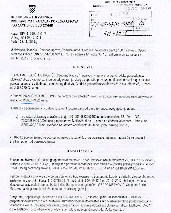 Osim toga, postoje i druge obveze Grada koje nisu knjižene, ali koje će Grad u narednim godinama vjerojatno morati platiti. Kada im se pridoda kredit, koji je podigao bivši gradonačelnik, stvarne su obveze Grada Metkovića i veće od spomenutih 17 milijuna kuna.