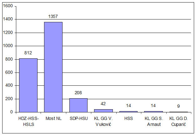 Ukupan broj vijećničkih mandata koje su liste osvojile na izborima ne pruža stvarnu sliku rezultata izbora jer se ne može uspoređivati mandat u mjesnom odboru u kojemu je glasovalo 37 glasača s onim u kojemu je glasovalo 1251 glasač. Projekciju tih rezultata na razini cijeloga grada napravili smo tako kao da su bili izbori za Gradsko vijeće. Prema D'Hondtovu metodu u Gradskome vijeću Most NL imao bi 10  vijećnika, Koalicija HDZ-HSS-HSLS 6 vijećnika, a SDP-HSU 1 vijećnika.