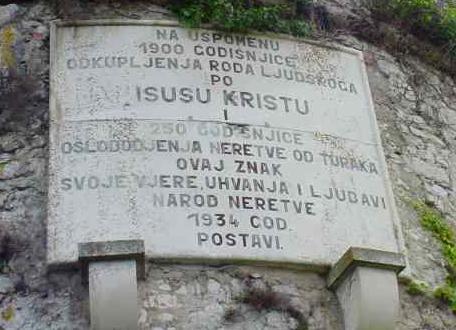 Iako su posljednji primili kršćanstvo, Neretvani (a ne, kao što što se često čuje, Neretljani) svoje, mnogima nepoćudno, zapadnorimsko naslijeđe ističu gdje god mogu. Tako je narod Neretve 1934. osjetio potrebu obilježiti 1900 godina od otkupljenja Isusovog za spas čovječanstva i spomen-ploču postavi na bivšu tursku kulu. Orijentacija spomen-ploče logična je za to vrijeme, Neretva je bila glavna prometnica prema Metkoviću, pa se ona može vidjeti samo ploveći Neretvom.