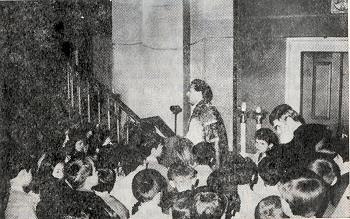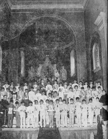 Nati'snula se djeca kod oltara. Iza njih sve puno mla-doži. Na