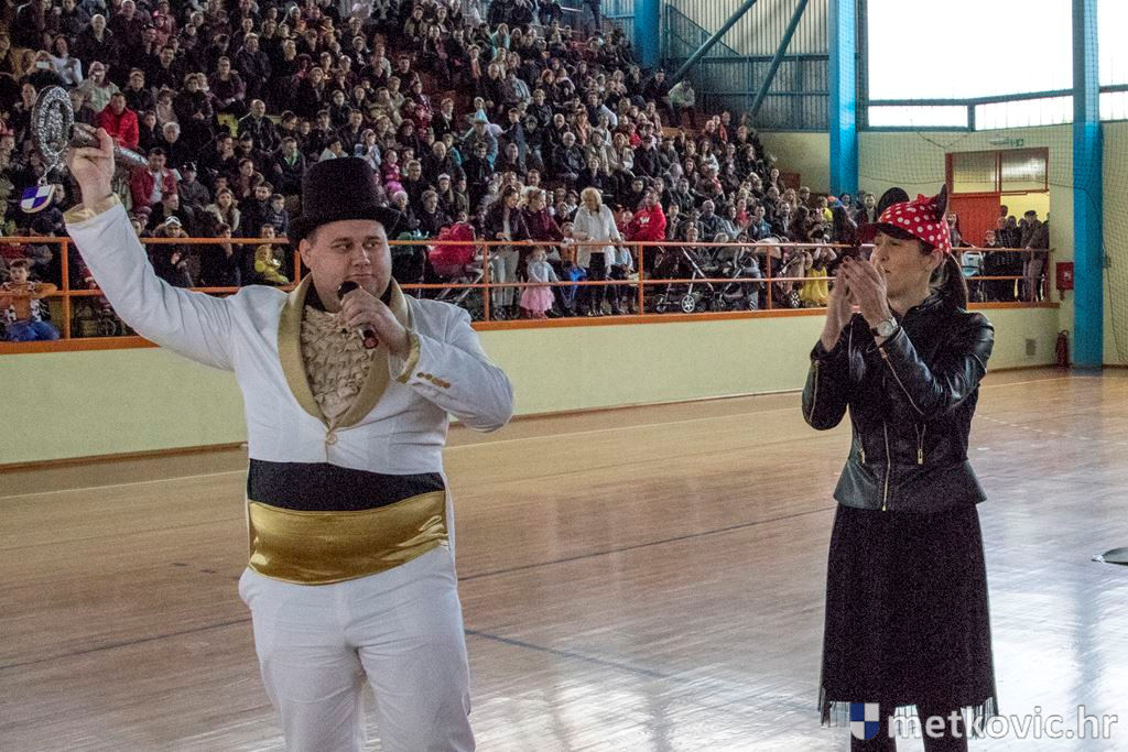 Za to se pobrinuo voditelj Plesne škole 'Calypso' Dalibor Dominiković, maškaran u Dadu Čokoladu. Plesala se 'makarena' i još štošta, no prije toga je gradonačelnica Katarina Ujdur (jedva smo je prepoznali pod maskom) Velikome Meštru na deset dana predala Ključ od Grada. Kada se taj dočepao mikrofona obećao je takve ludorije koje bi iz svojih predizbornih obećanja izbacio i jedan HSUB (Hrvatska stranka uživatelja bunike). Primjerice, obečao je (ovdje je Č prema starokrnjsavačkome govoru koji su istisnuli „dobrodošle“) Boži Petrovu u deset dana izgraditi kuću od dva milijuna kuna, površine od 38 metara četvornih, uključujući i dva pitara za cvijeća.