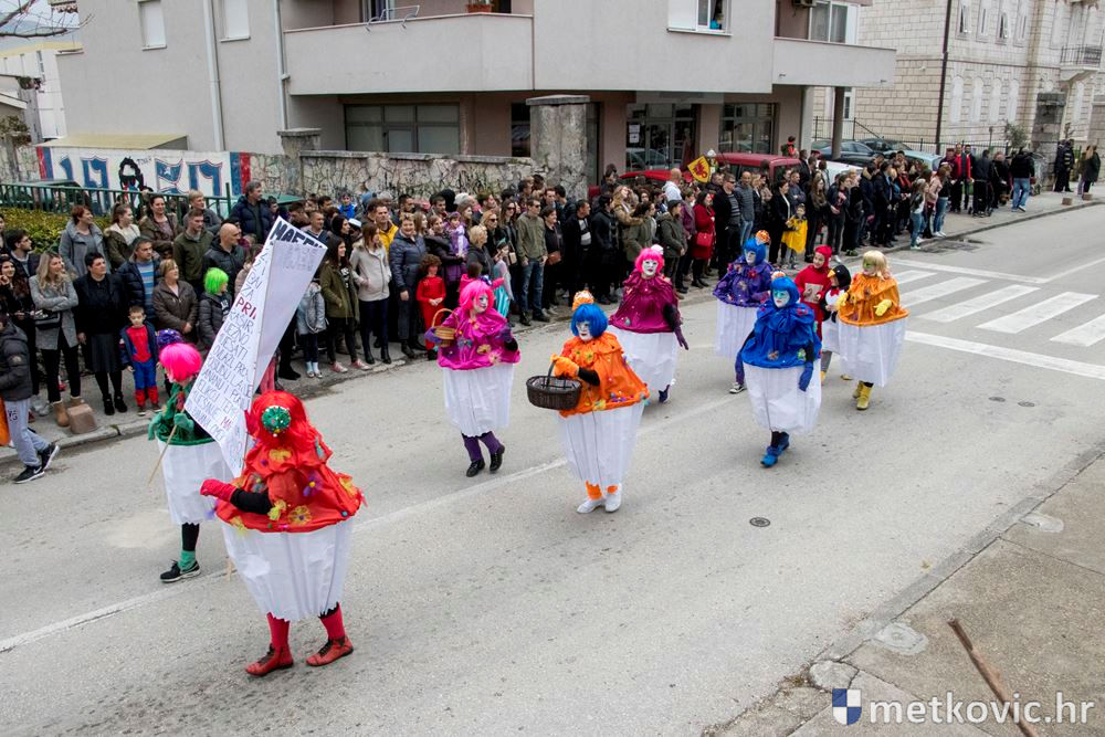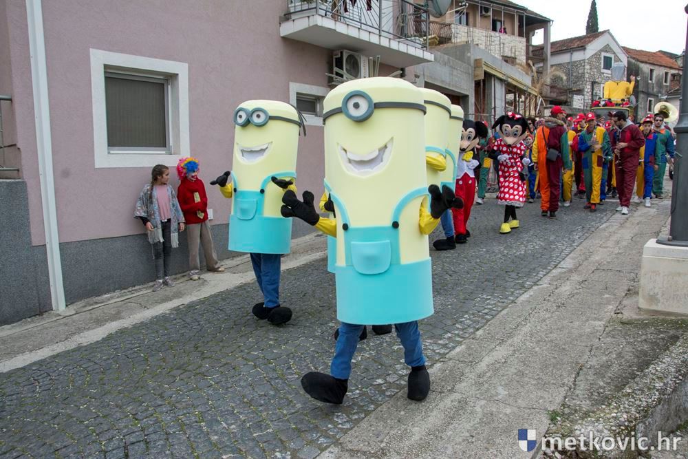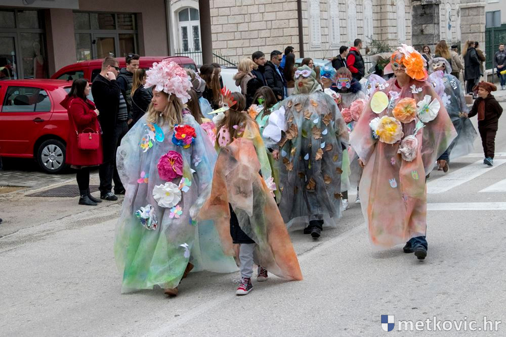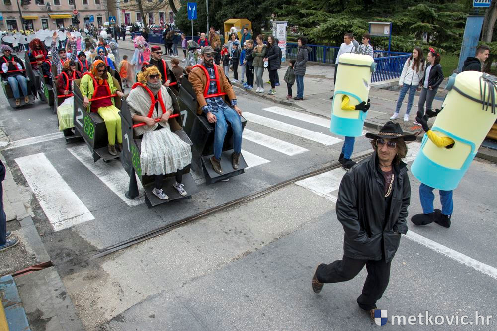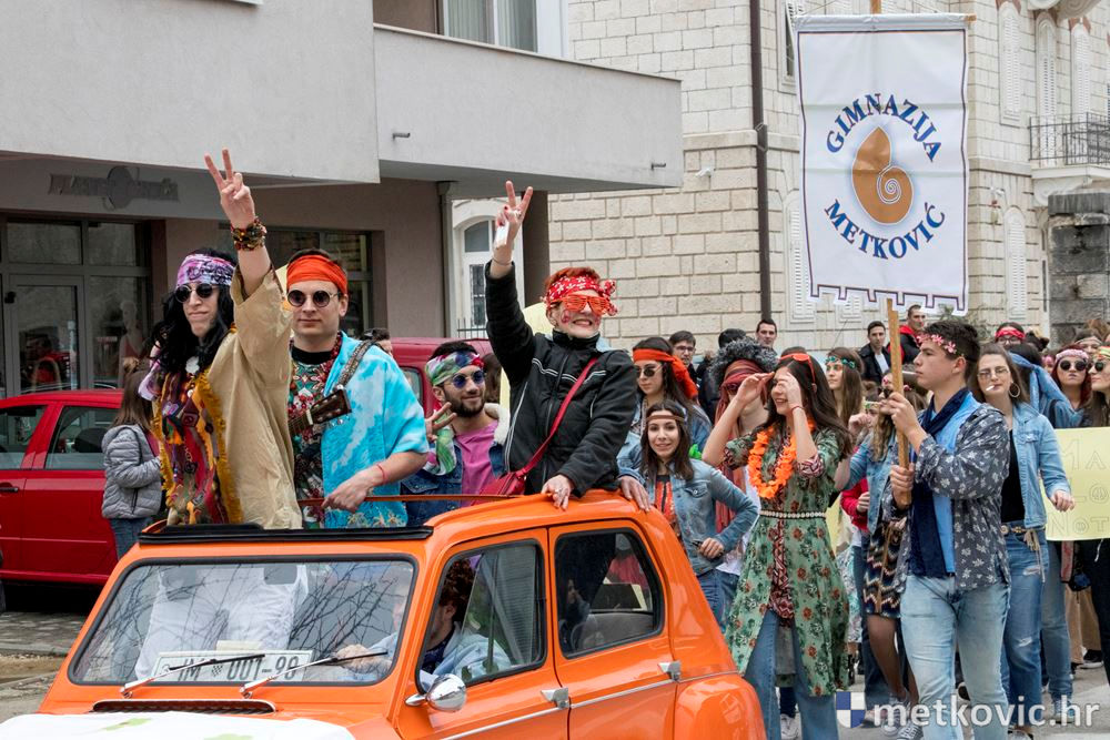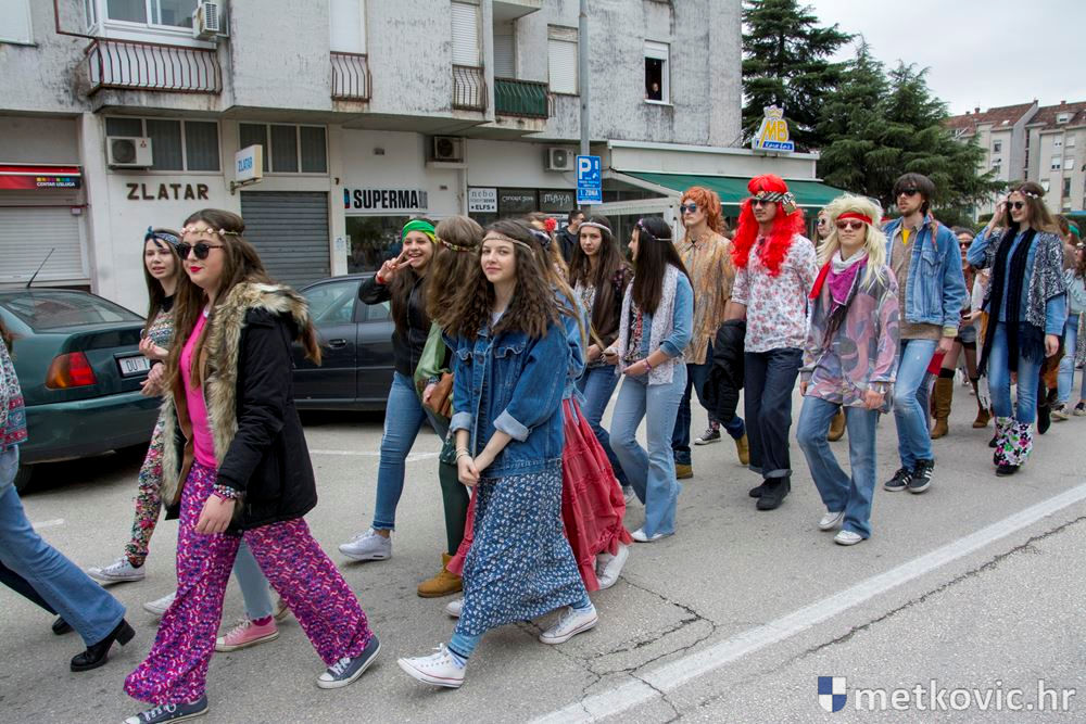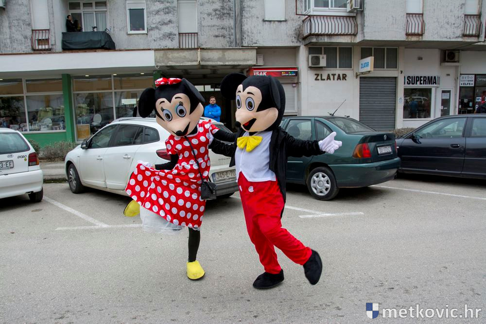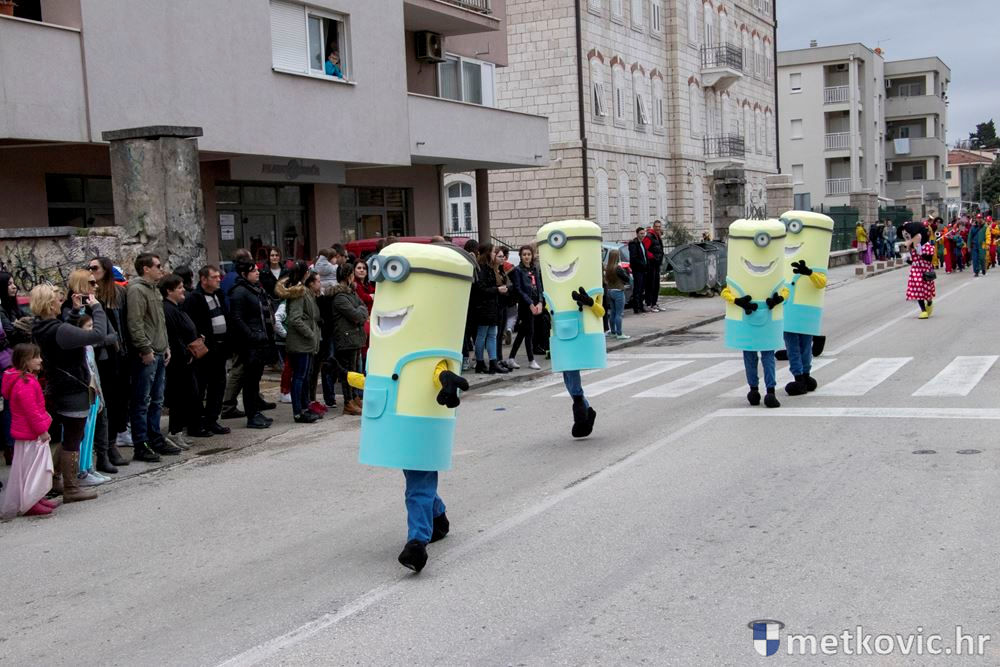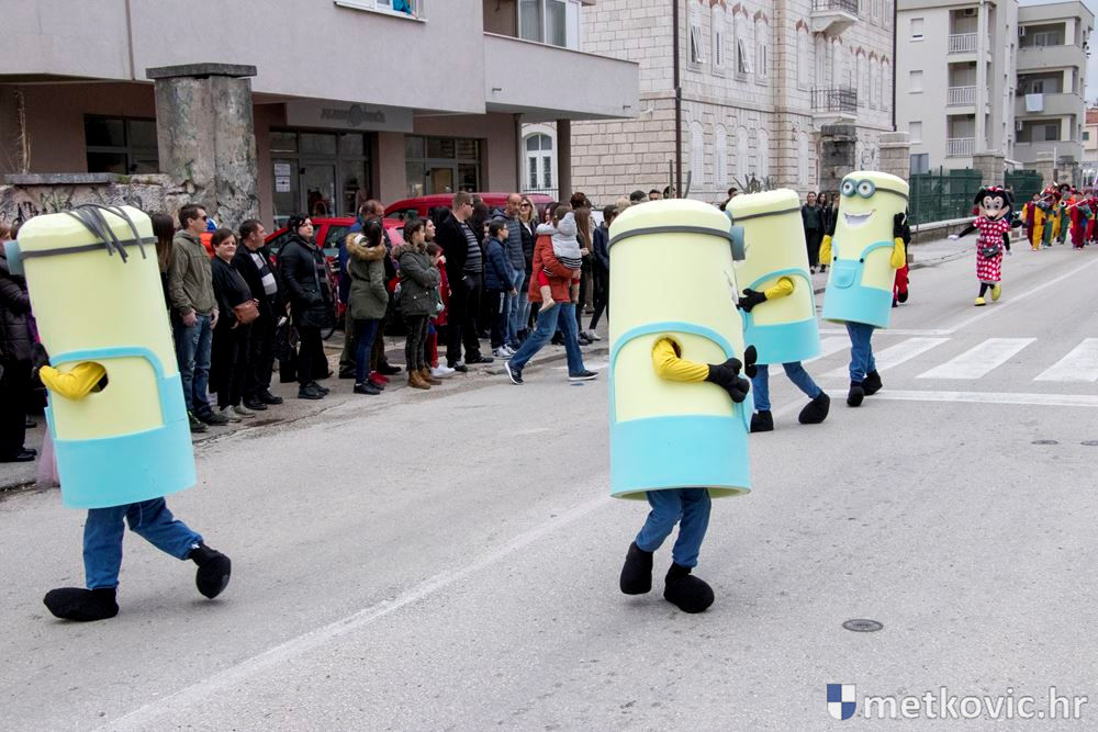 gimnazijalci koji su se maškarali u hipije. Prirodoslovni muzej Metković maškarao se u Četiri godišnja doba, a poslije njih u povorci su se mogli vidjeti Mickey i Minnie Mouse, Kiri Minions, Mačkari Vid, Pokladno društvo Prud, Veseli cvjetići i Vlak smrti.