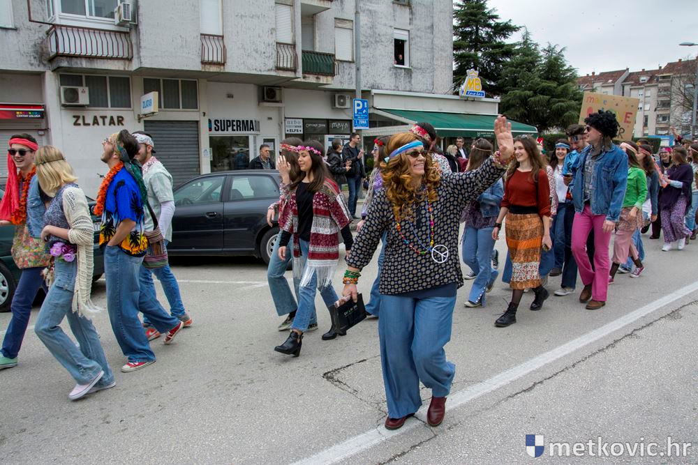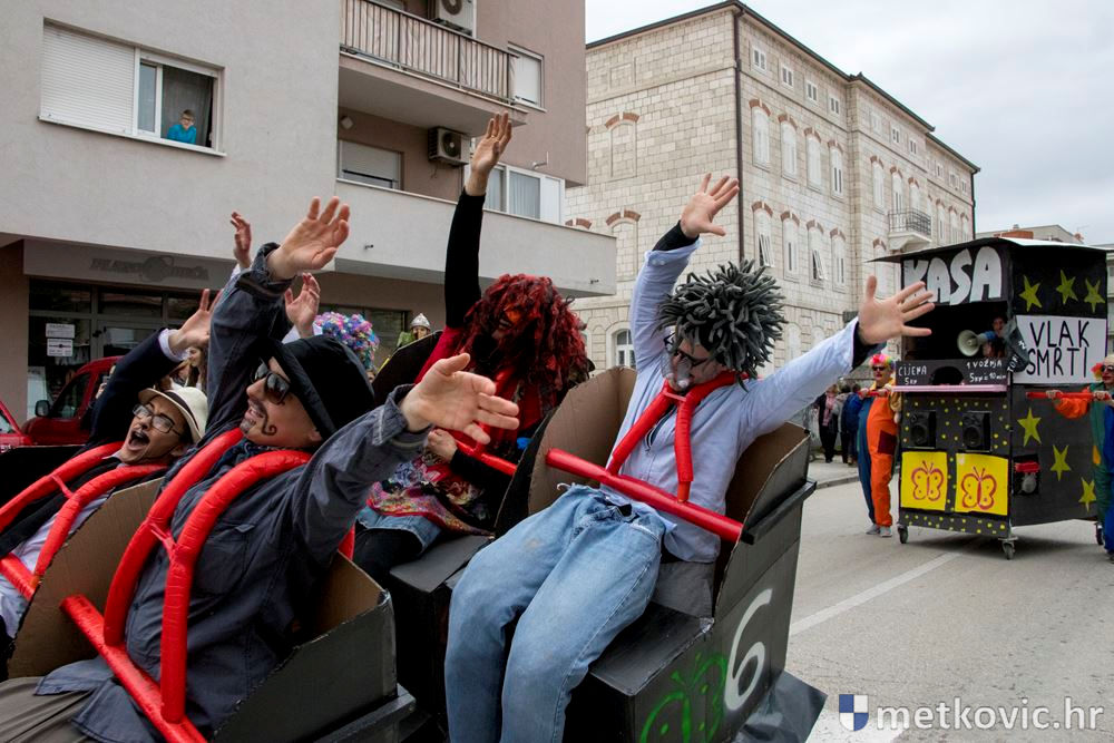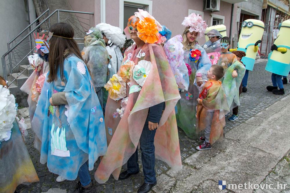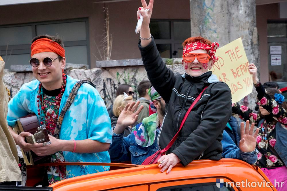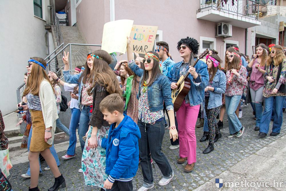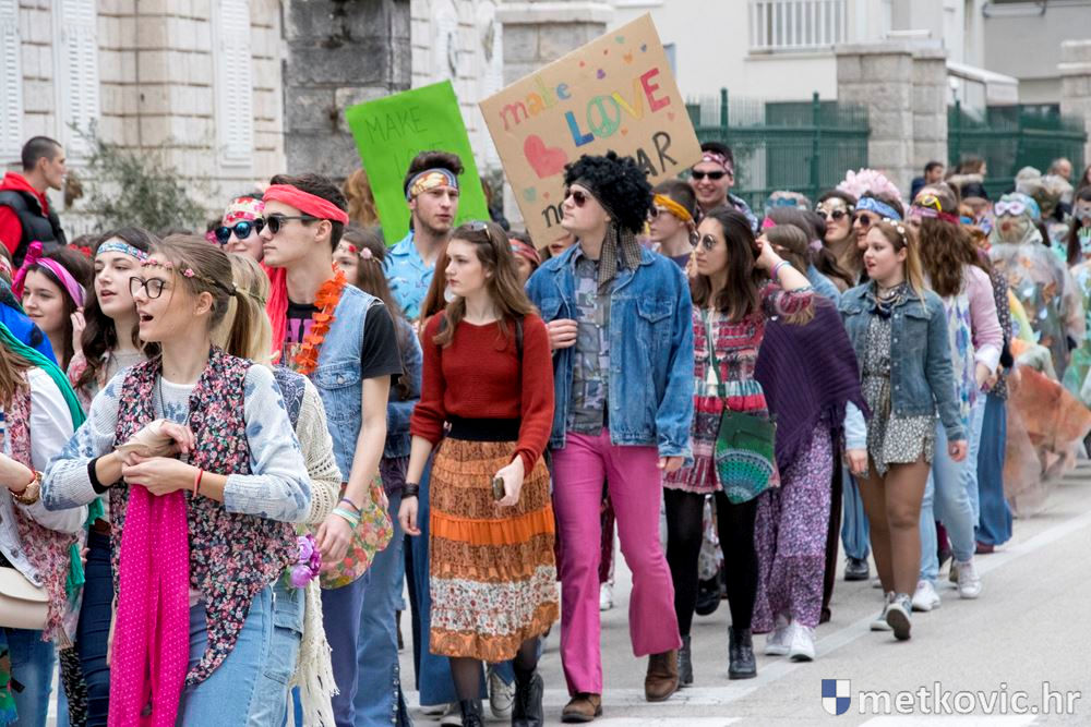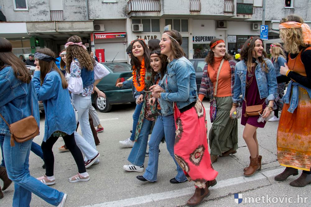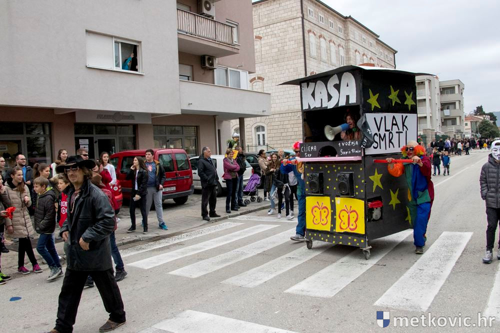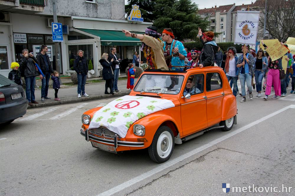 gimnazijalci koji su se maškarali u hipije. Prirodoslovni muzej Metković maškarao se u Četiri godišnja doba, a poslije njih u povorci su se mogli vidjeti Mickey i Minnie Mouse, Kiri Minions, Mačkari Vid, Pokladno društvo Prud, Veseli cvjetići i Vlak smrti.