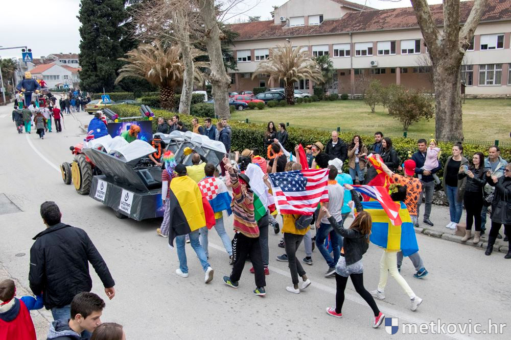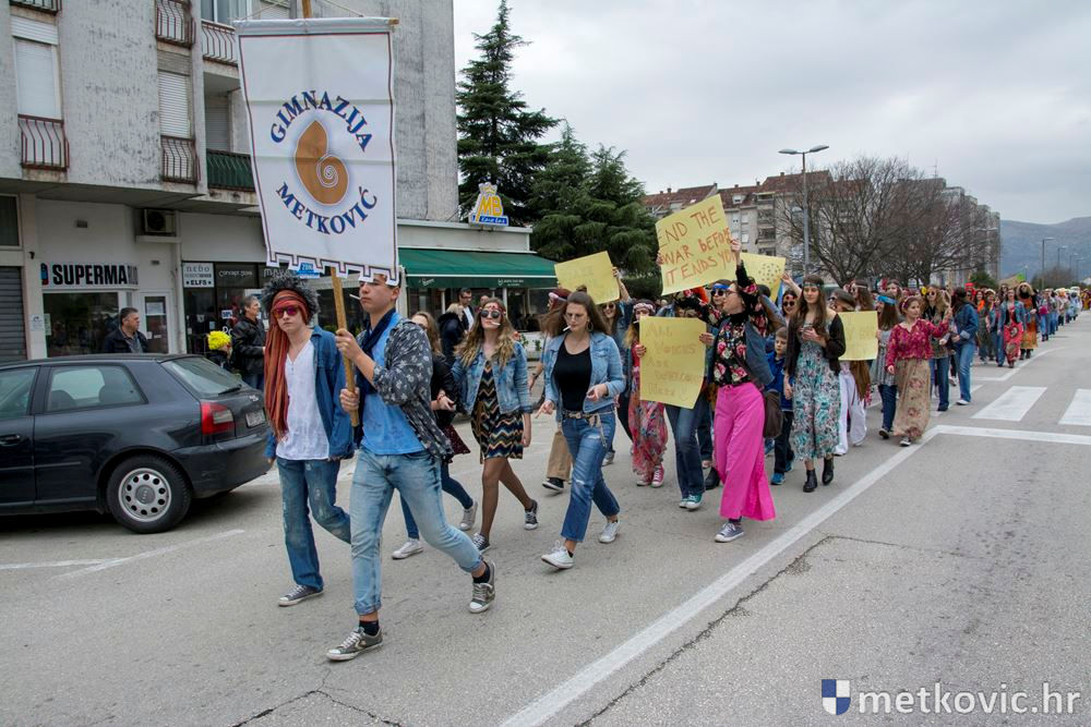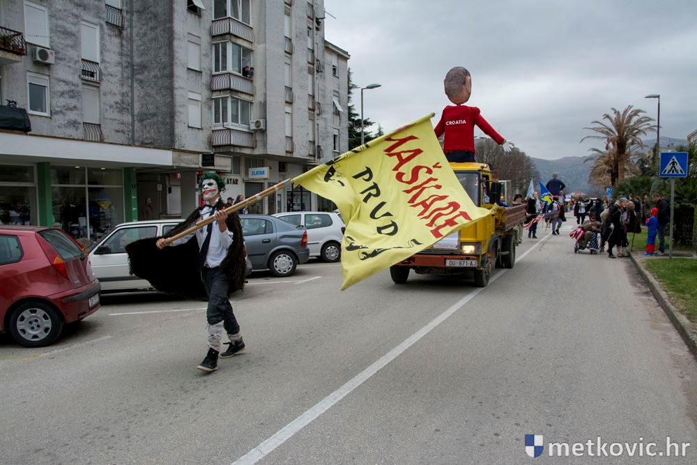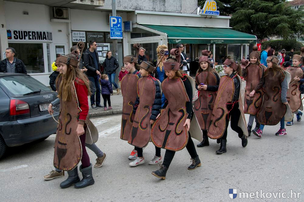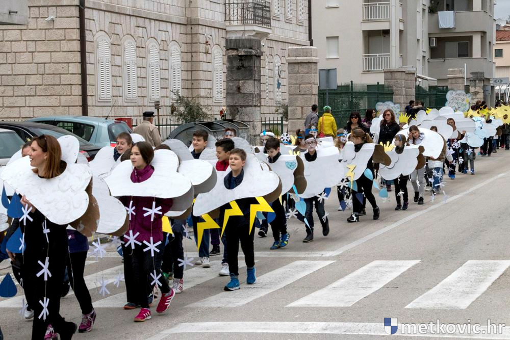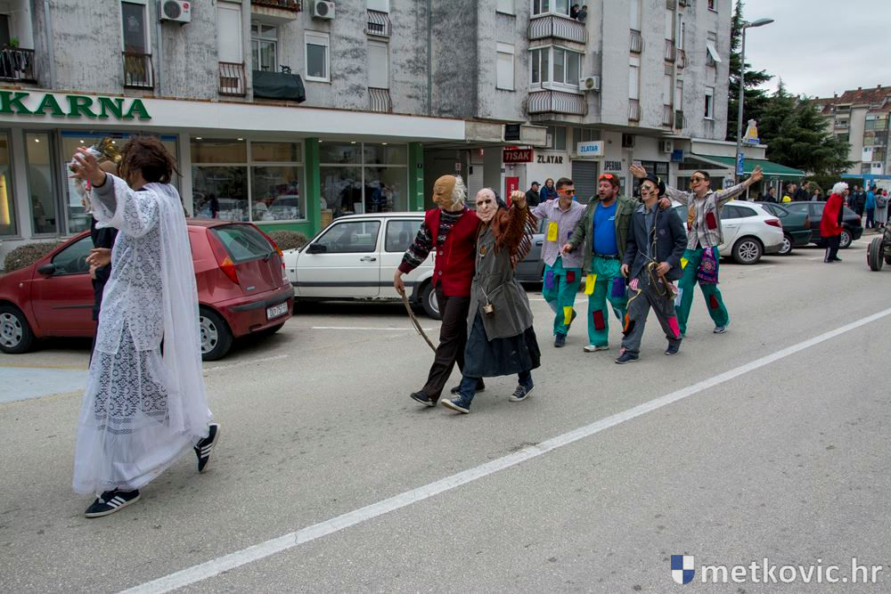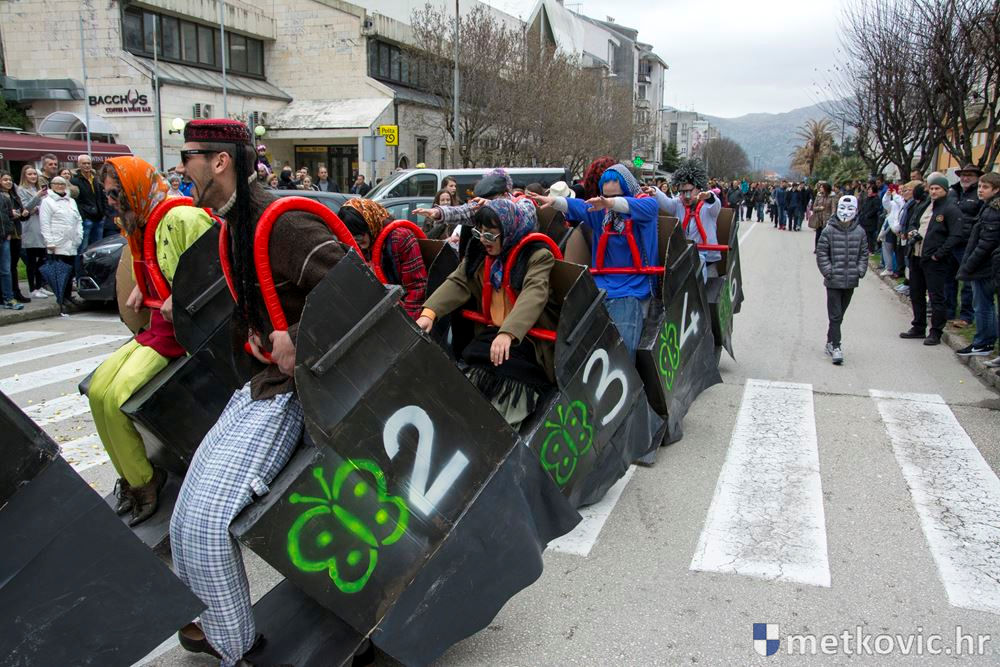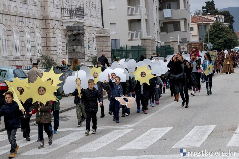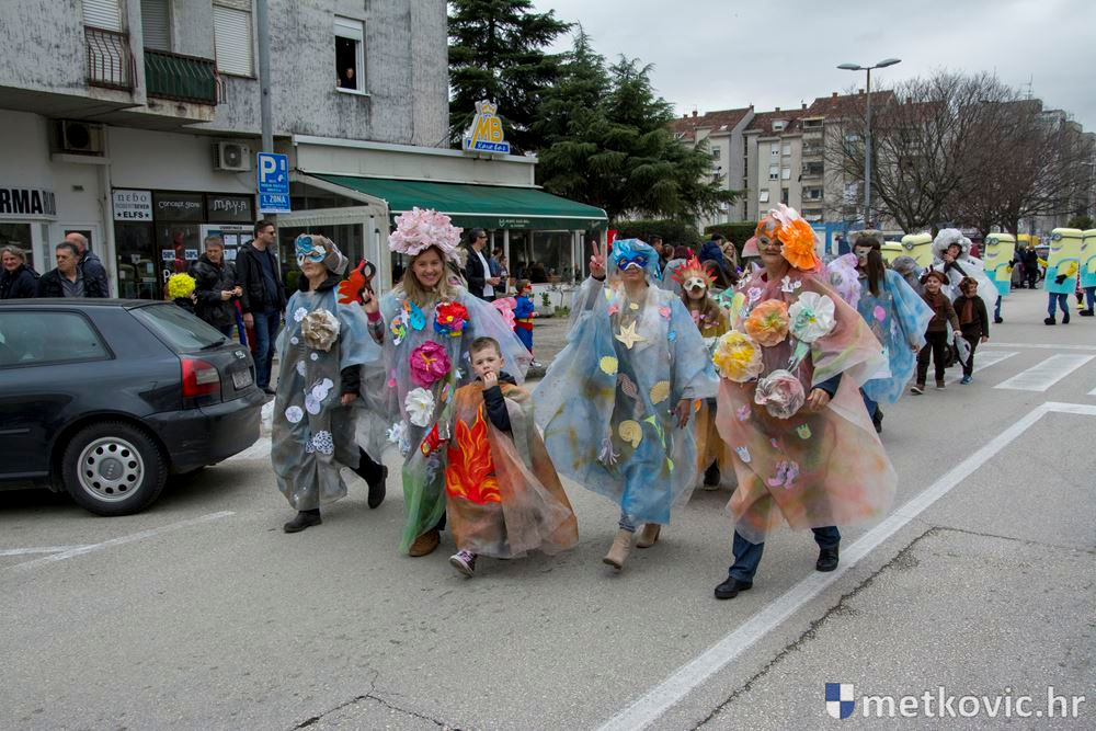 gimnazijalci koji su se maškarali u hipije. Prirodoslovni muzej Metković maškarao se u Četiri godišnja doba, a poslije njih u povorci su se mogli vidjeti Mickey i Minnie Mouse, Kiri Minions, Mačkari Vid, Pokladno društvo Prud, Veseli cvjetići i Vlak smrti.