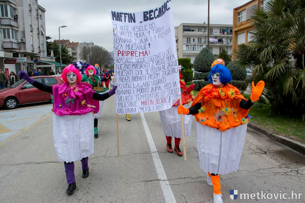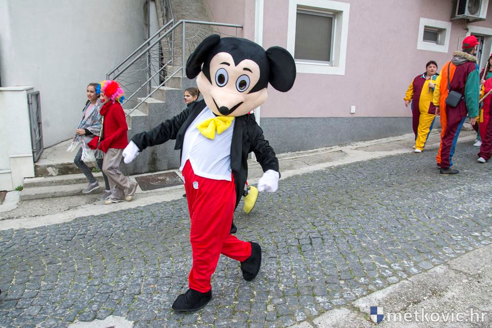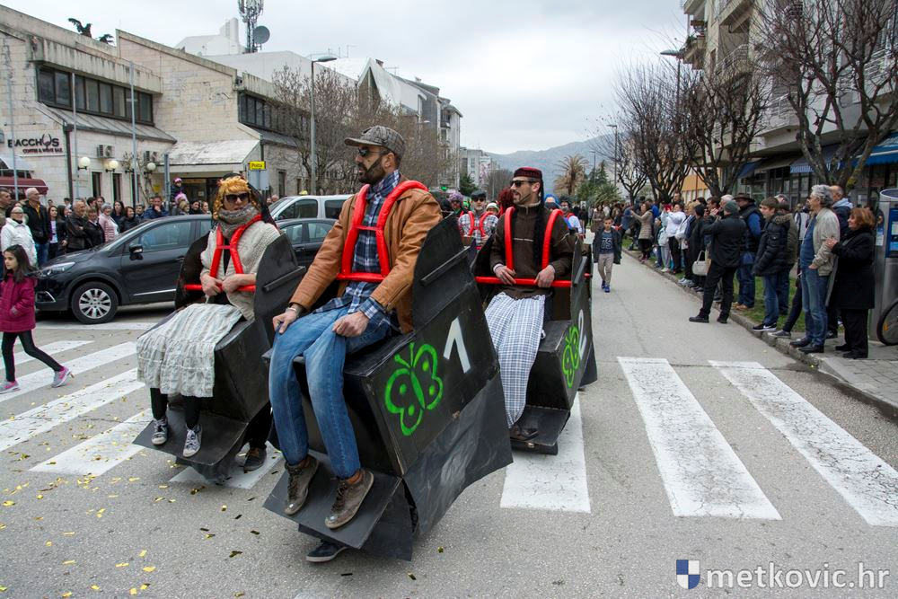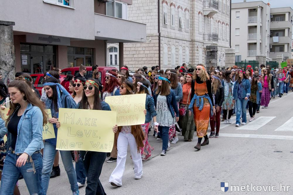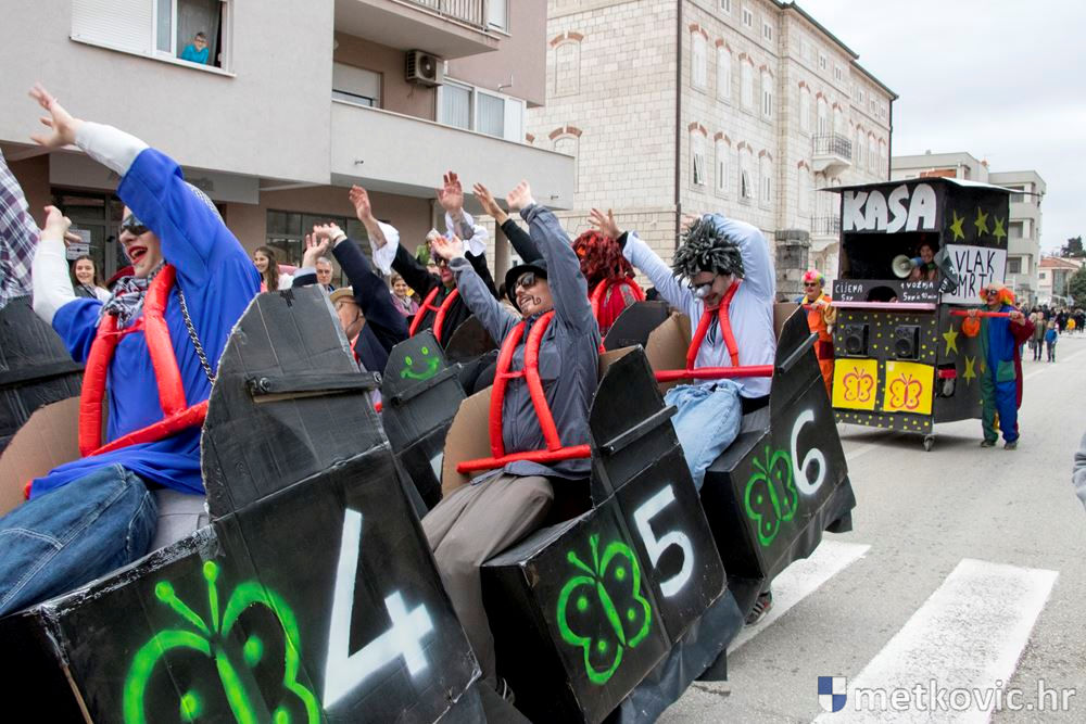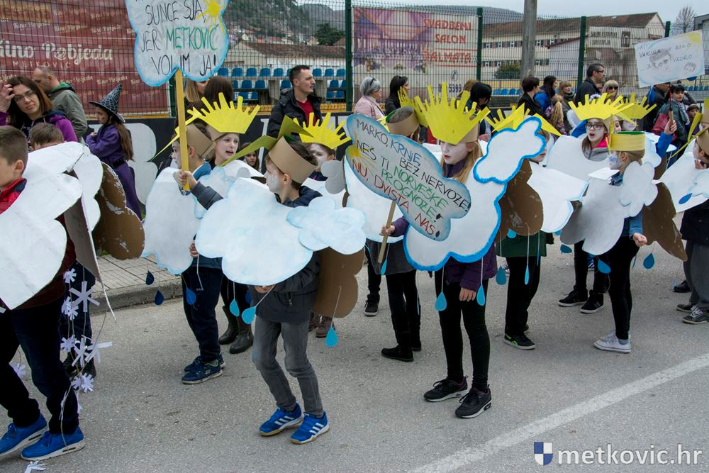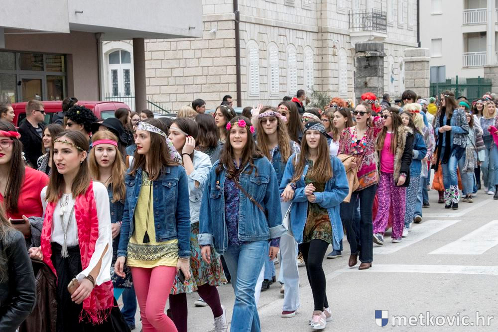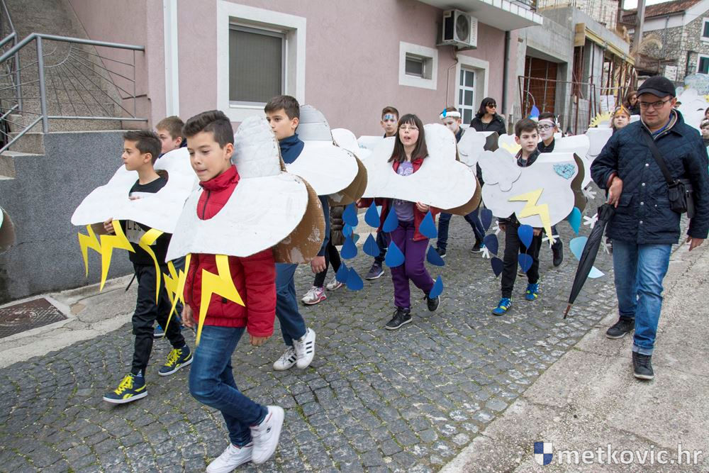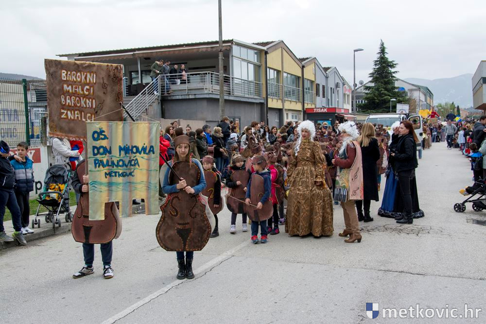 gimnazijalci koji su se maškarali u hipije. Prirodoslovni muzej Metković maškarao se u Četiri godišnja doba, a poslije njih u povorci su se mogli vidjeti Mickey i Minnie Mouse, Kiri Minions, Mačkari Vid, Pokladno društvo Prud, Veseli cvjetići i Vlak smrti.