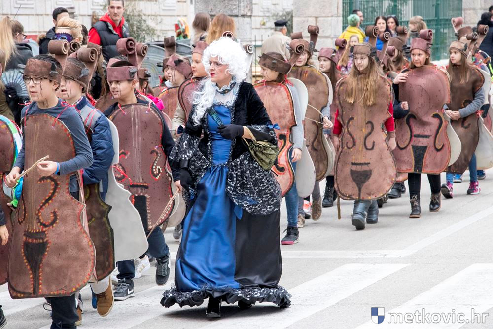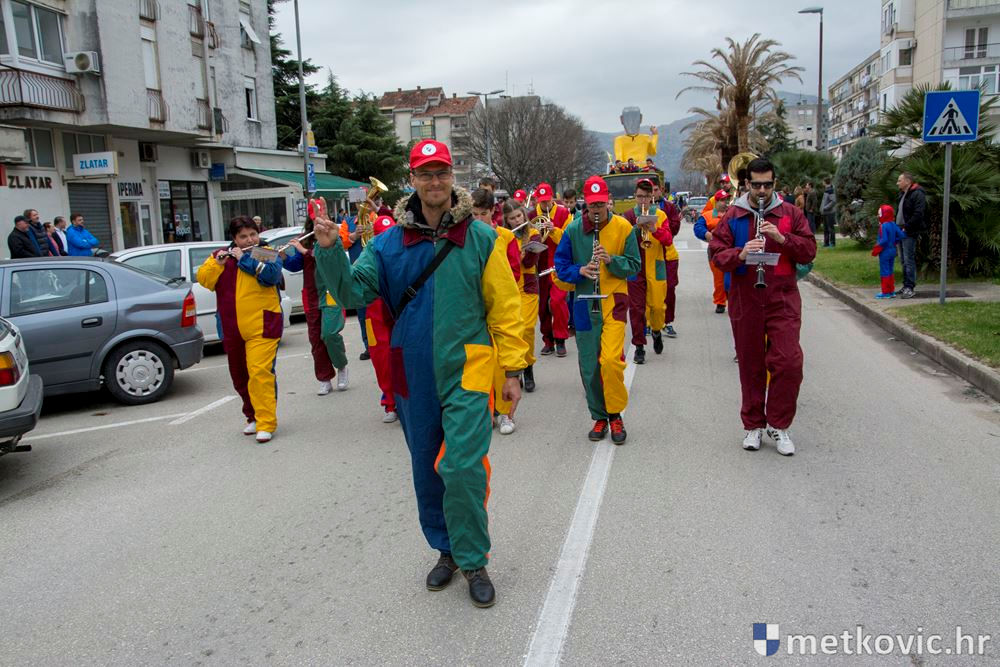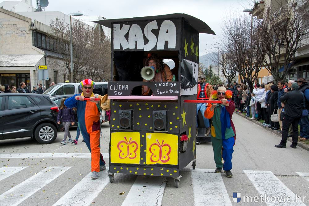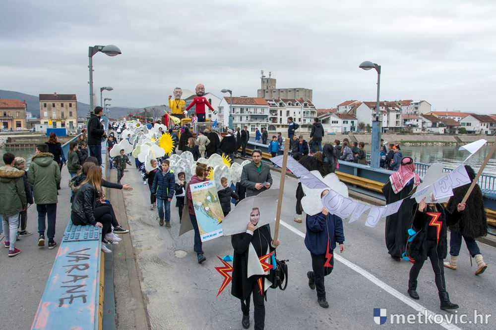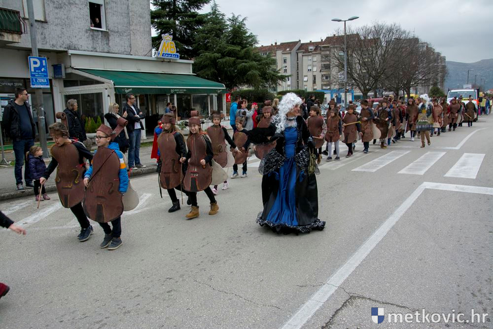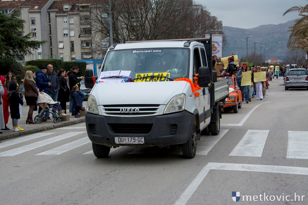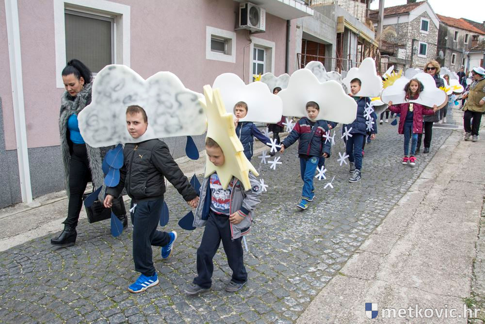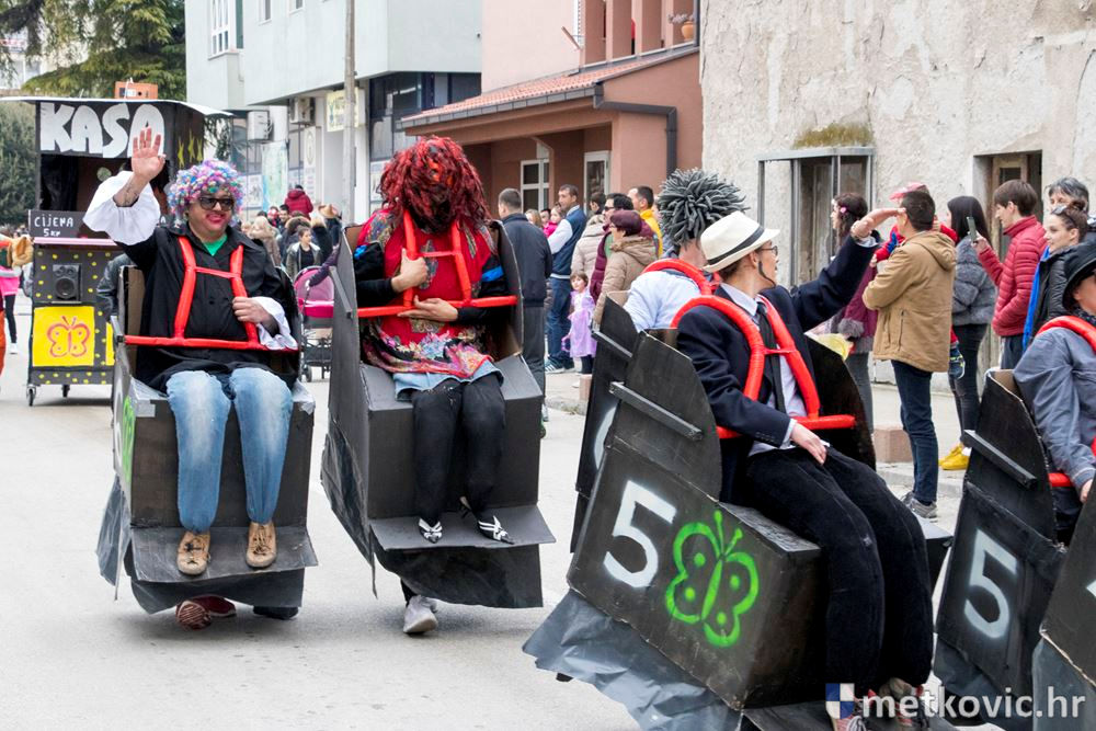 gimnazijalci koji su se maškarali u hipije. Prirodoslovni muzej Metković maškarao se u Četiri godišnja doba, a poslije njih u povorci su se mogli vidjeti Mickey i Minnie Mouse, Kiri Minions, Mačkari Vid, Pokladno društvo Prud, Veseli cvjetići i Vlak smrti.