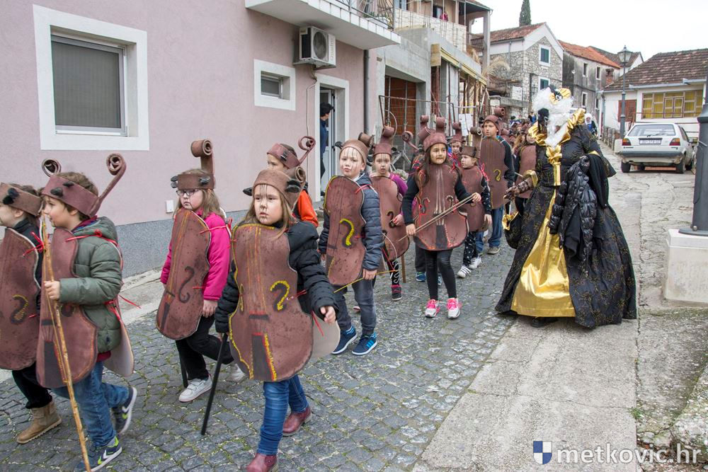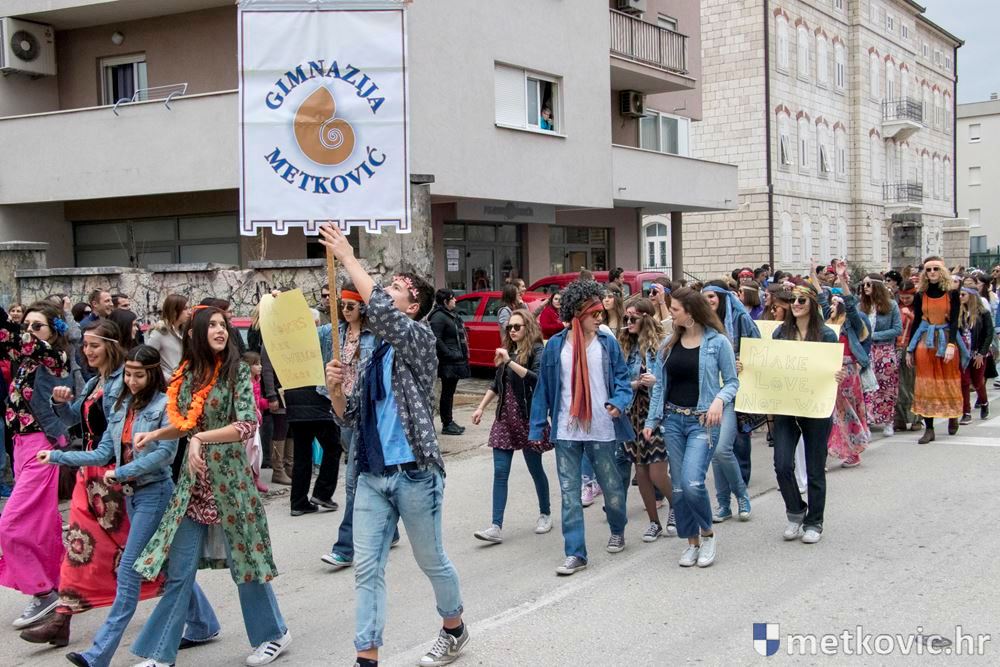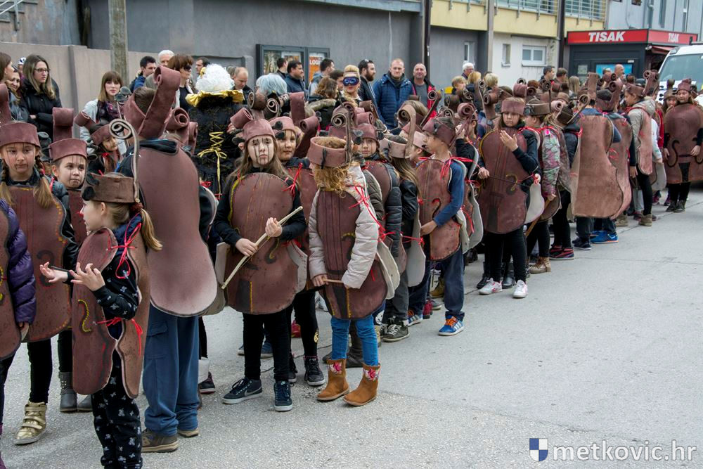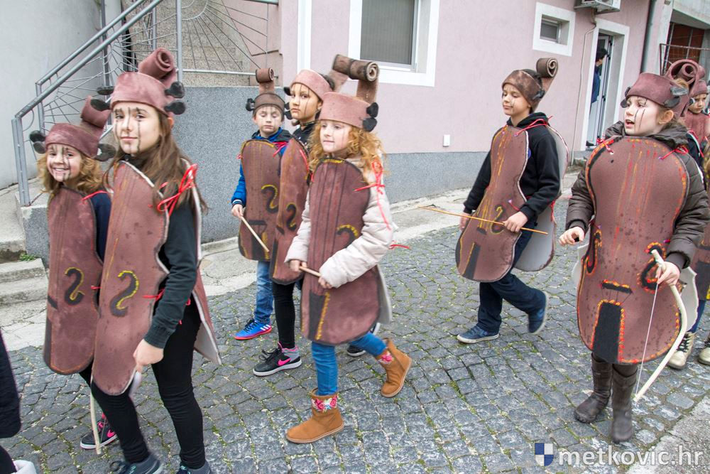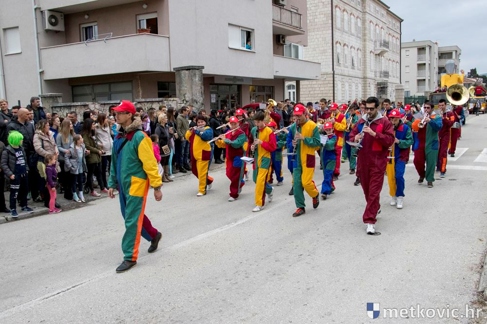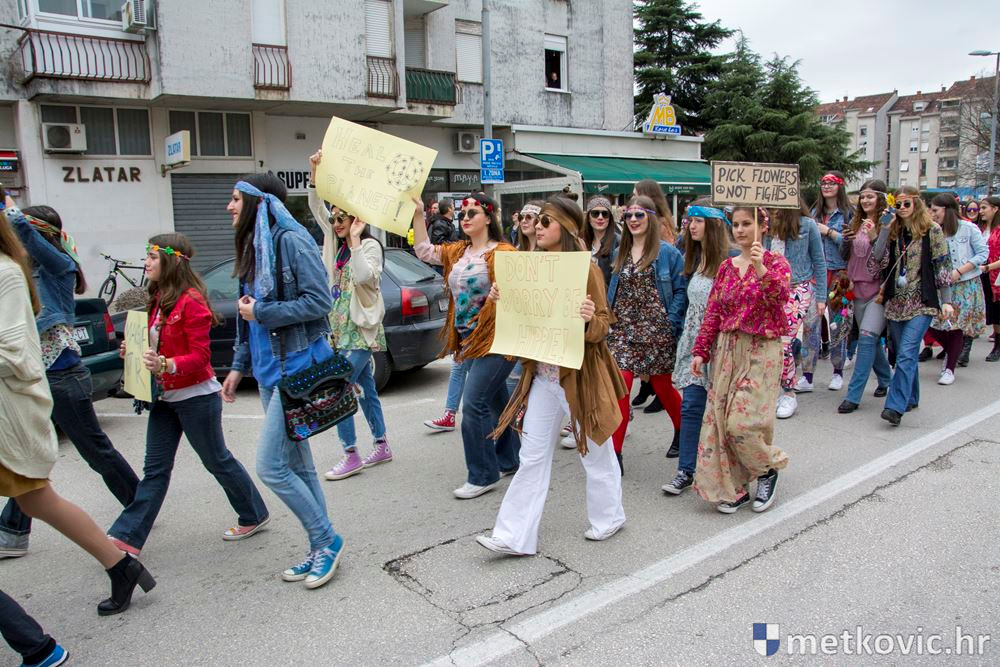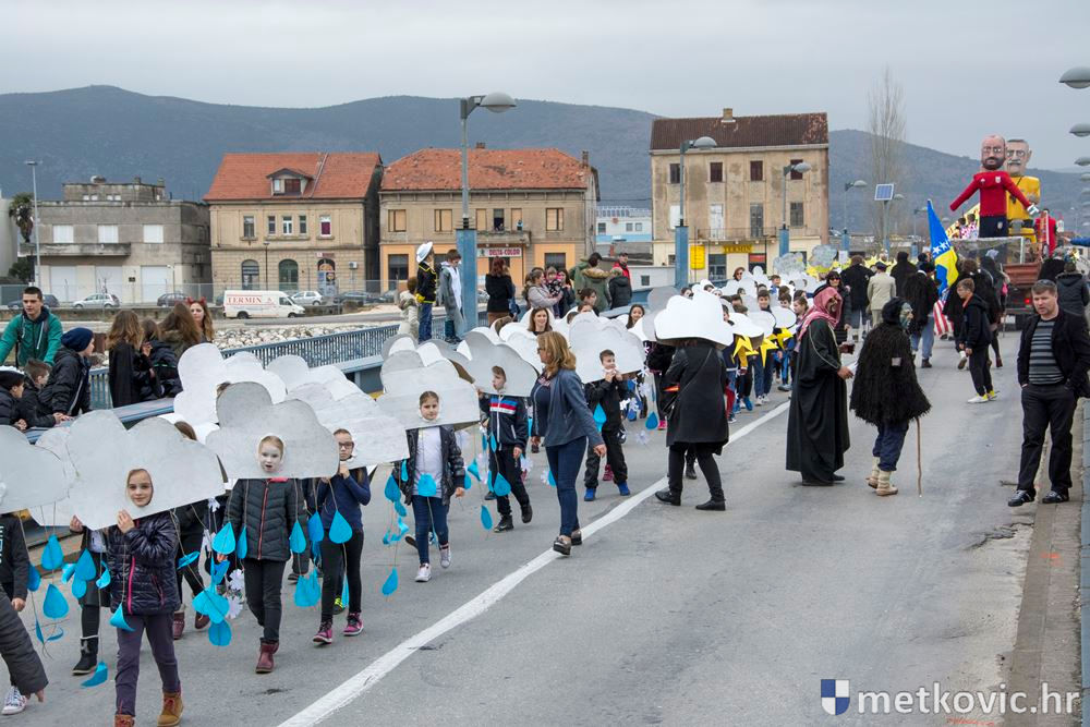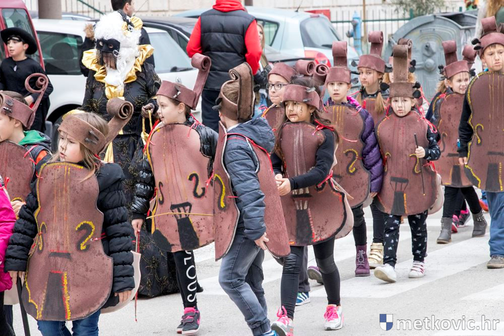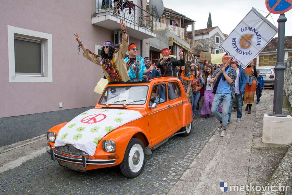 gimnazijalci koji su se maškarali u hipije. Prirodoslovni muzej Metković maškarao se u Četiri godišnja doba, a poslije njih u povorci su se mogli vidjeti Mickey i Minnie Mouse, Kiri Minions, Mačkari Vid, Pokladno društvo Prud, Veseli cvjetići i Vlak smrti.