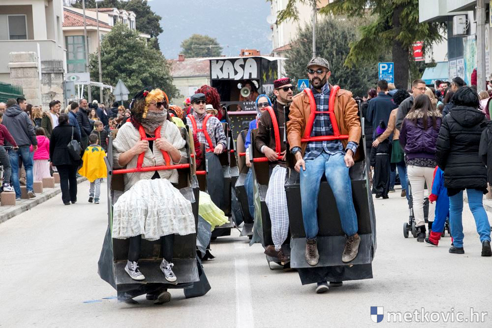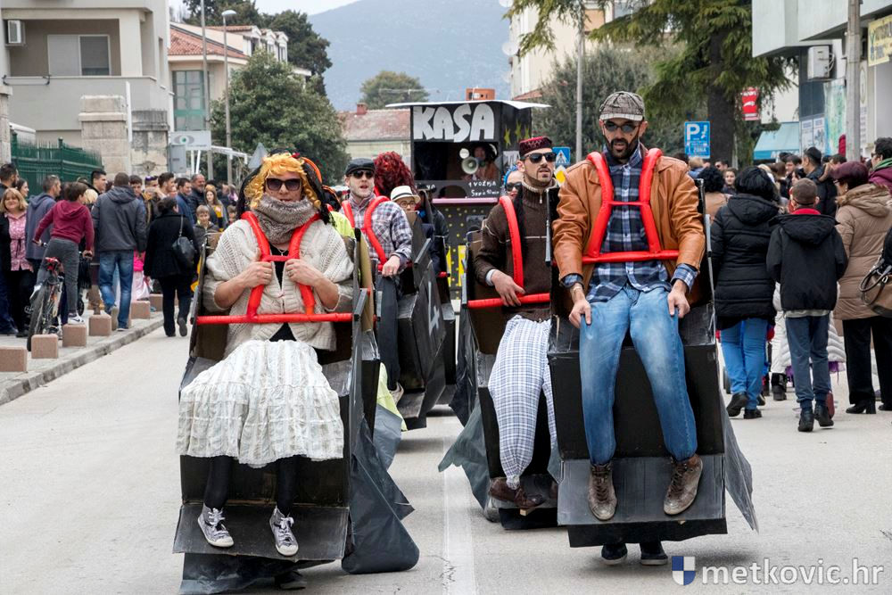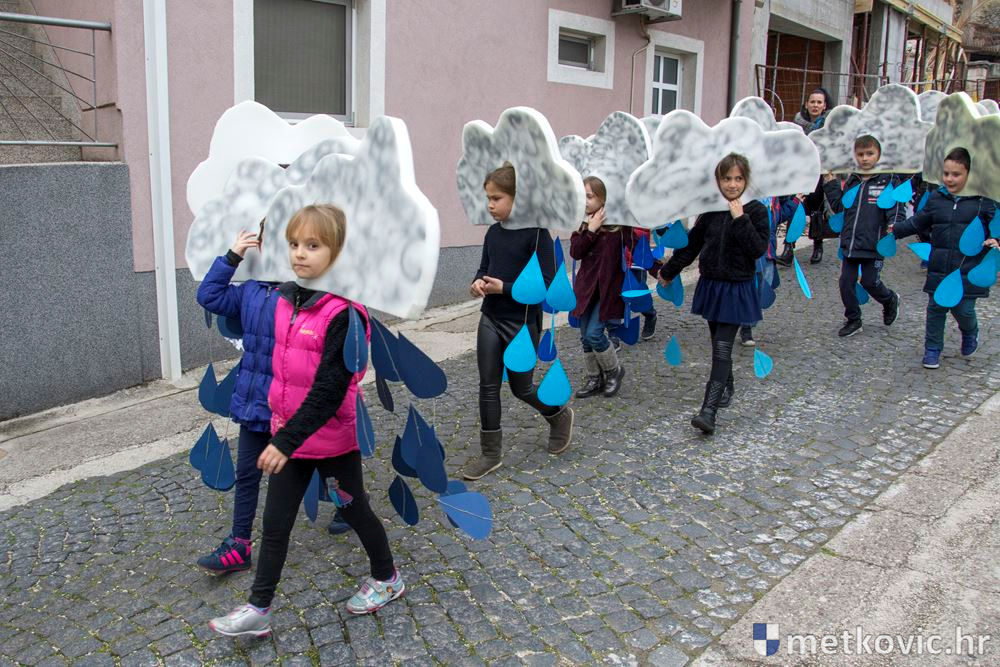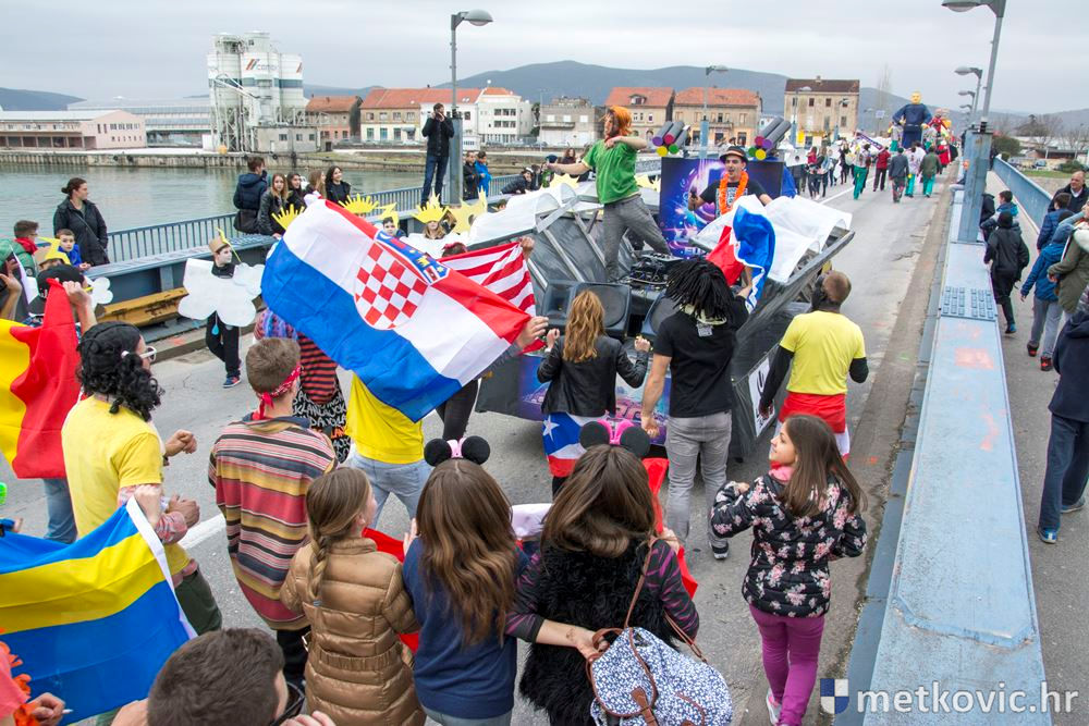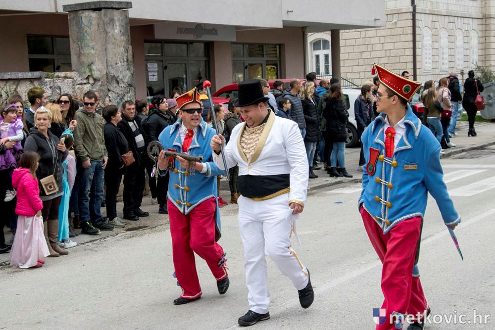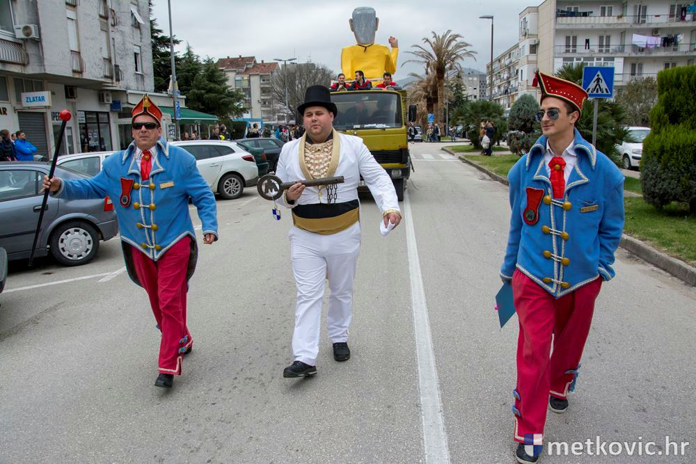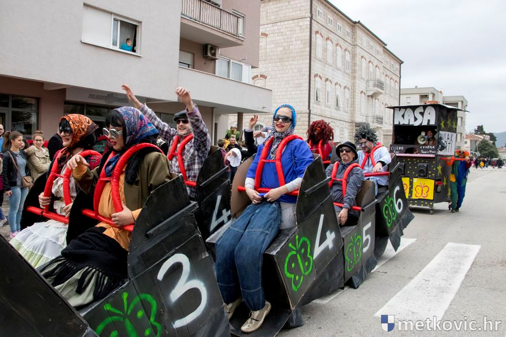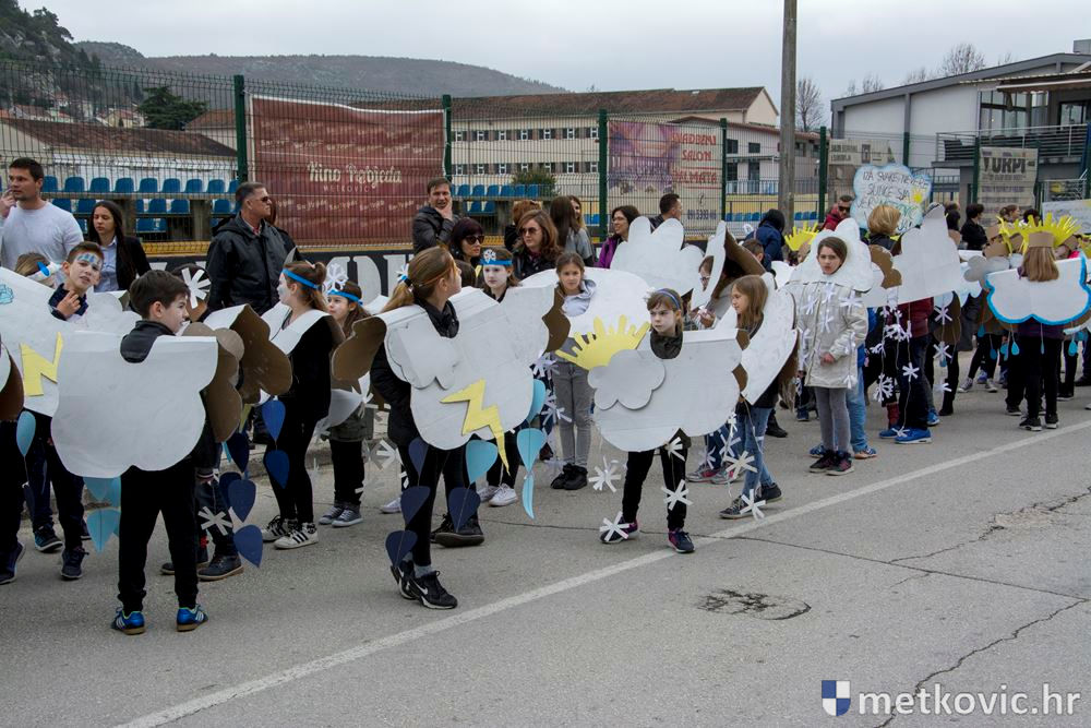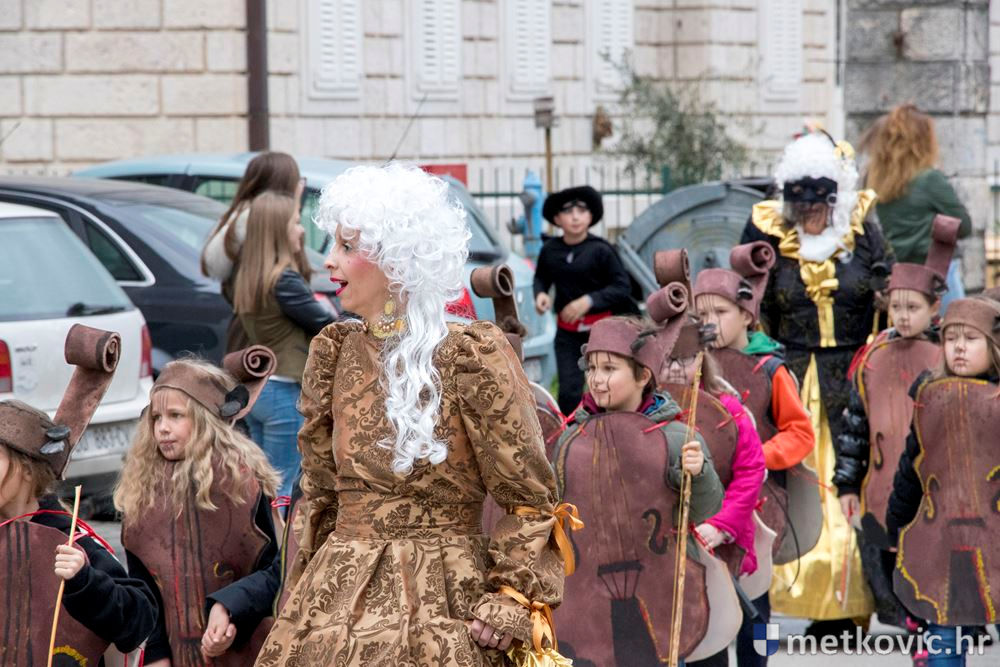 gimnazijalci koji su se maškarali u hipije. Prirodoslovni muzej Metković maškarao se u Četiri godišnja doba, a poslije njih u povorci su se mogli vidjeti Mickey i Minnie Mouse, Kiri Minions, Mačkari Vid, Pokladno društvo Prud, Veseli cvjetići i Vlak smrti.