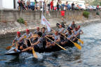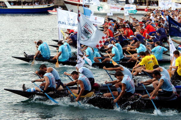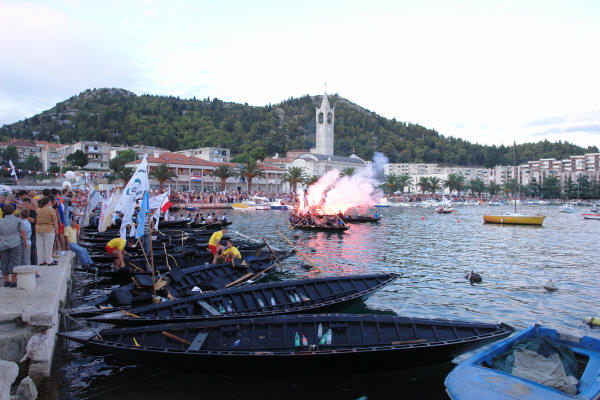 Sjedamo u automobil i upućujemo se na desnu stranu Neretve smatrajući da će na cesti prema Kuli Norinskoj biti manja gužva. Vrlo brzo zaključujemo da je i tamo krkljanac. Milimo do Kule i tamo jedva uspijevamo dostići dva broda s gostima grada Metkovića koji su plovili na začelju. Prve lađe već su prošle Krvavac. Kako je županijska cesta kroz Krvavac preko Opuzena i Komina uska, u Kuli skrećemo preko Bagalovića na Desne te na Banji ponovno izlazimo na nju. Na mostu je, preko kanala koji spaja Neretvu i Crnu rijeku, mnoštvo ljudi koji žele vidjeti koja će posada prva proći ispod tumbina. Nema mjesta za parkiranje pa produžujemo do Rogotina. Tamo ista stvar. Produžujemo prema Pločama gdje zatječemo kompletnu glavnu ulicu pretvorenu u štekat što se nastavlja sve do crkve. Mami nas miris roštilja. Ništa riba i vino, samo ćevapčići, pljeskavice i pivo. Bujrum! Na rivi je masa svijeta što iščekuje Rogotinjane i Kominjane koji se, kako saznajemo putem radija, bore za prvo mjesto. Takav poredak je i ostao do samoga kraja, možda iznenađenje, budući da su Kominjane svi držali favoritima, no, Rogotinjani su, očito, pustili da se protivnik ispuše i znalački održali pobjedničku poziciju do cilja. U Pločama je već svejedno je li pobijedio Komin ili Rogotin jer, i jedni i drugi tamo imaju brojne navijače, a teritorijalno spadaju pod grad Ploče ili, kako je kasnije rekao glumac amater prof. Tomislav Zubčić u liku kneza Domagoja, sam Bog zna kojim su sve rodbinskim vezama povezani Rogotin i Komin. Nastaje opća fešta Rogotinjana uz vidno razočaranje Kominjana.