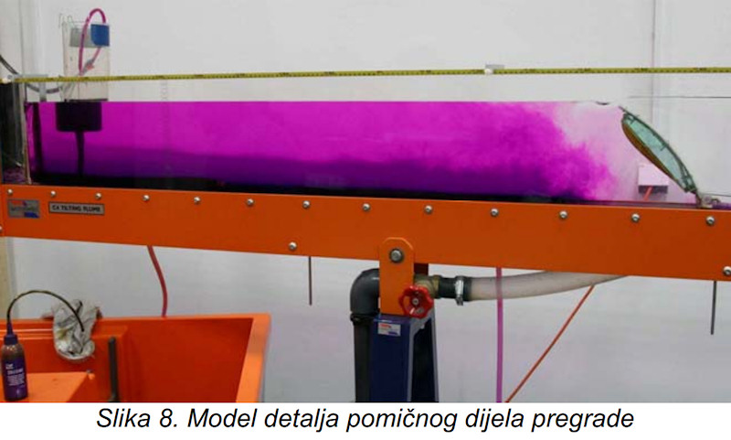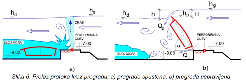 Pregrada se sastoji od pet segmenata širine 22 m i visine devet metara. To su šuplje čelične konstrukcije koje se vrlo jednostavno pri smanjenim dotocima izdižu okomito na tlo, a pri većim dotocima Neretvom poliježu uz dno. Pogonsko „gorivo“ je komprimirani zrak koji ispunja šuplju strukturu i tjera je na zakretanje oko osi i uzdizanje u okomit položaj. Izbacivanjem zraka u segmente ulazi voda i oni liježu uz dno. Važno je napomenuti da je pregrada u uspravnom položaju samoregulirajuća. Pri povećanom dotoku ona se nagiba i slatka voda se preko nje prelijeva nizvodno. Osim toga, u temeljima pregrade ostavljeni su ispusti koji omogućuju trajno protjecanje slatke vode.
