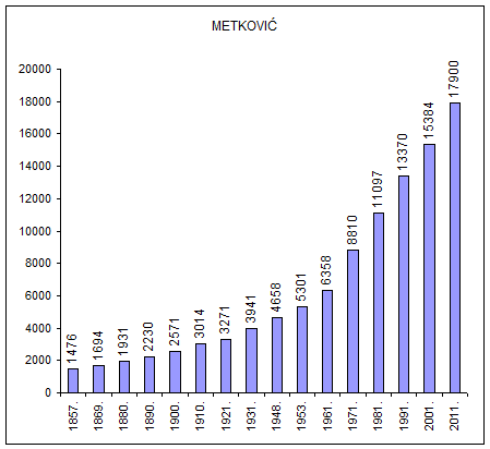 Godine 2001. grad Metković s prigradskim naseljima imao je gotovo 15400 stanovnika, a sam Metković nešto manje od 14 tisuća. Analizirajući demografske promjene od 1981. na ovamo i uvažavajući što se sve dogodilo proteklih devet godina došli smo do podatka da bi dogodine u Metkoviću moglo biti oko 16 tisuća stanovnika, a na području cijeloga Grada nešto manje od 18 tisuća. Pri tome smo u obzir uzimali stanogradnju koja je bujala proteklo desetljeće te pozitivan razvoj situacije u najvećim prigradskim naseljima Vidu i Prudu. Promjene u naseljima Dubravica i Glušci, zbog veličine naselja, ne bi trebale bitno utjecati na ukupne podatke.