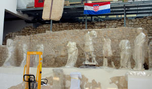 Ovih dana dolazi ostatak kipova sa restauracije pa će ih na tribini biti ukupno šesnaest. Eksponati izloženi na policama uz stubište Mali keramički tanjur sa reljefom vojnika Da su Rimljani itekako imali što čuvati, pokazuju i ovi, za to vrijeme, komplicirani željezni ključevi.