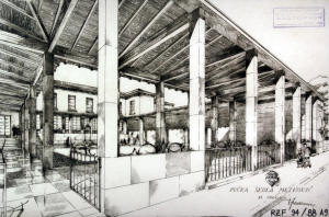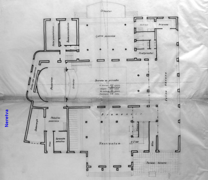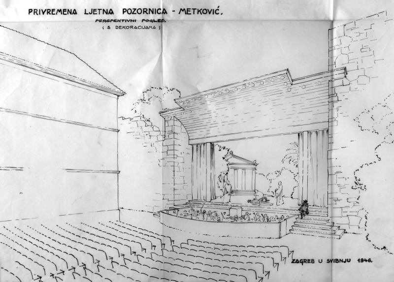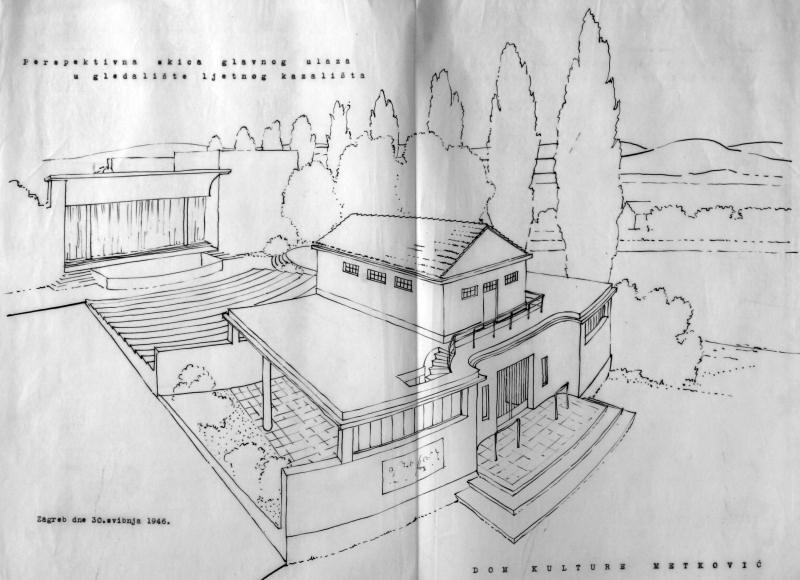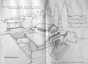 Skica ljetnoga kazališta s kućicom za kinoprojektor na terasi iznad glavnoga ulaza (nikada nije sagrađena).