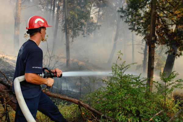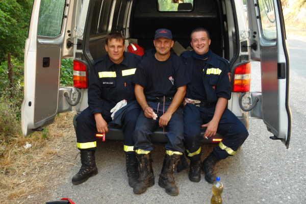 Na terenu je sva tehnika i vatrogasci JVP Metković kojima pomažu kolege iz drugih jedinica. Požar je jedno vrijeme gasio i kanader, a jedan helikopter cijeli dan pokušava zaustaviti frontu požara, no to je nedovoljno i požar u večernjim satima cijelom frontom od podnožja do vrha Šibanice napreduje prema Predolcu, gdje bi mogle biti ugrožene i kuće. Vatra je stigla do same ceste prema Dubravici Pripadnik JVP Metković u akciji Kritično mjesto obrane je Pavlovača - vrh Šibanice Duga nakon naleta helikoptera sa oko 2000 l vode Iako helikopter vodu uzima u obližnjem natapnom kanalu... ... i vrlo brzo je istrese na požarište... ... vatra se nakon toga brzo rasplamsa. Na fotografiji vidi se fronta požara koja je zahvatila mladu borovu šumu. Lijevo u kutu je stara šuma koja se nastavlja na Predolac gdje počinju prve kuće. Kratak predah. Momci iz Karlovca na „ljetnoj gaži“