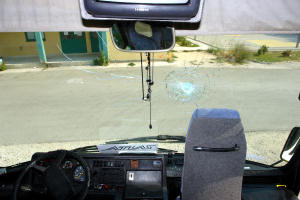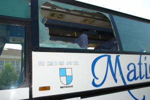 U kratkom razgovoru s njim saznali smo da mu je prva šteta načinjena već na dolasku u Podgoricu kad je policajac pendrekom razbio staklo na vratima. Najveći problemi nastali su na povratku. – Na čelu i začelju kolone bilo je po jedno policijsko vozilo, a svaki put kada bi kolona usporila bili smo kamenovani. Stradalo mi je ukupno pet stakala plus šteta na limariji. Ali nije samo ta šteta problem, sad mi je u jeku sezone autobus bar 15 dana izvan pogona. – rekao nam je Stipe Matić.