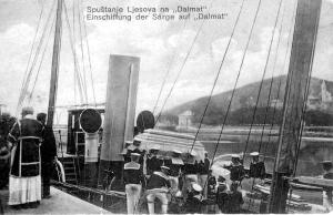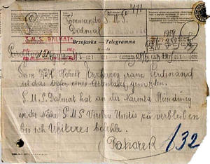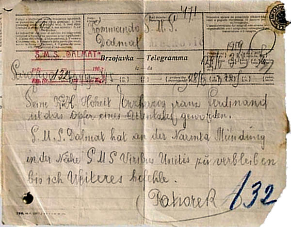 Original brzojava kojim glavni i vojni inspektor Potiorek 28. lipnja 1914. javlja na Dalmat da je “Njegovo Carsko i Kraljevsko Veličanstvo Nadvojvoda Franjo Ferdinand pao kao žrtva atentata“ i naređuje da „brod Dalmat čeka na ušću Neretve uz Viribus Unitis sve dok ja ne dam daljnje upute“. U jednom od sljedećih brzojava Potiorek javlja “Poseban vlak s tijelima stiže sutra, 30. lipnja u šest ujutro u Metković kade će tijela biti odmah prebačena na Dalmat koji će ih odvesti na Viribus Unitis.“ Nadalje Potiorek traži da na Viribus Unitusu bude spreman torpedni čamac za prijevoz prtljage i posluge. Nakon isplovljavanja bojnoga broda traži da Dalmat otplovi u luku Gruž.