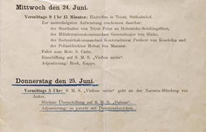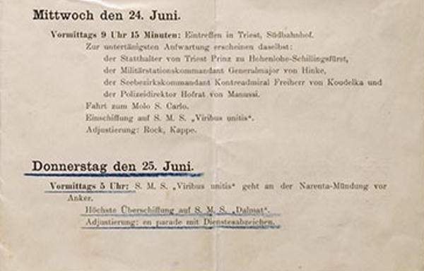 Izvadak originalnog programa putovanja iz kojeg se vidi da će bojni brod Viribus Unitis iz Trsta krenuti 24. lipnja u 9 sati i 15 minuta te da će se usidriti na ušću Neretve 25. lipnja u pet sati. Nakon toga Franjo Ferdinand prelazi na manji brod Dalmat kako bi Neretvom doplovilo do Metkovića.