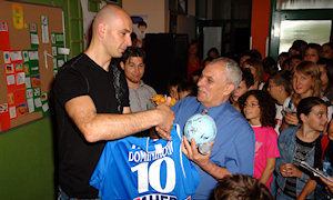 Metković, 6.6.2008. - Hrvatski rukometni reprezentativci Davor Dominiković i Ivan Čupić iskoristili su kratak predah pred pripreme za Olimpijadu kako bi posjetili školu u kojoj su započeli prve rukometne korake.